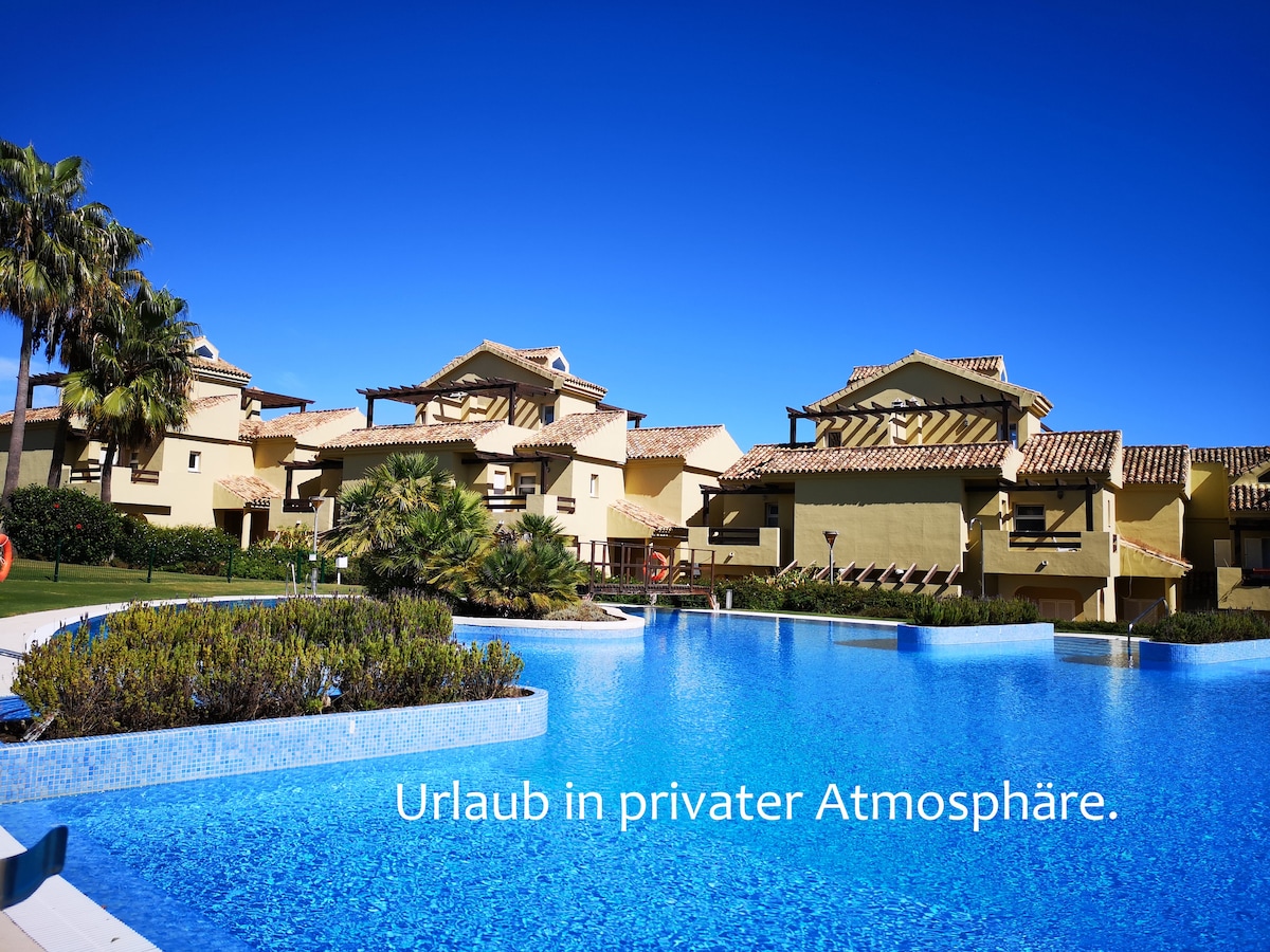 Your private space upstairs with 2–3 bedrooms, terrace, your own bathroom Your poolside terrace & kitchen with table, sun loungers, a 2nd bathroom + Shared villa areas (430m²): office space,... B&B: free simple breakfast High-speed Wi-Fi internet 300m: BEACH Playa La Barrosa, one of Spain’s best Walk to RESTAURANTS Ideal for a family (quiet, beach & all amenities) or digital nomads (office, fast WiFi) More info via message, photos + virtual tours at WWW .CHICLANA .EU (Booking only Airbnb)