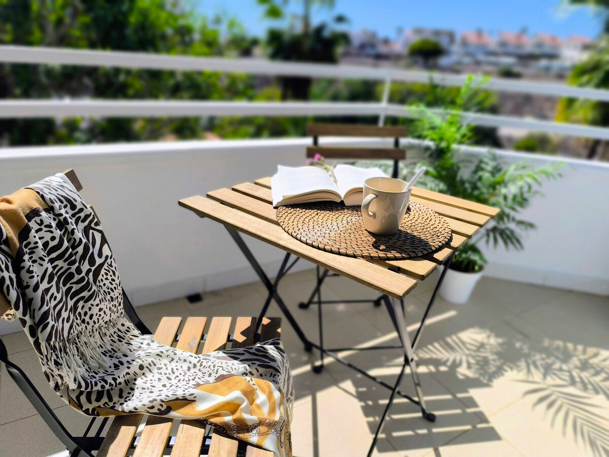 A GUEST FAVOURITE IS BACK! Renovated, refreshed, and with the same spectacular views as always. Located in the quiet Golf del Sur area, it features a spacious terrace equipped with sun loungers, barbecue and dining table, ideal for enjoying the outdoors at any time of day. With two bedrooms, two full bathrooms and comfortable and functional spaces, it is the perfect place for families, couples or friends looking to relax in a quiet environment with all amenities.