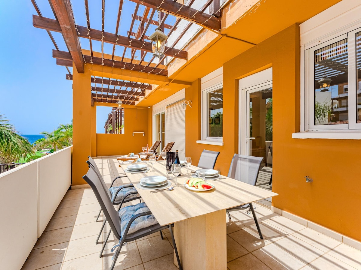 Maravilloso y amplio apartamento de dos dormitorios y dos baños en el corazón de Amarilla Golf. Esta propiedad ofrece una amplia terraza con vista frontal a la piscina, vista lateral al mar y varias piscinas al aire libre. Se proporcionan toallas, ropa de cama y artículos de aseo luxury totalmente gratuitos. El apartamento se encuentra dentro de una gran urbanización junto a los campos de golf de Amarilla Golf y Golf del Sur.