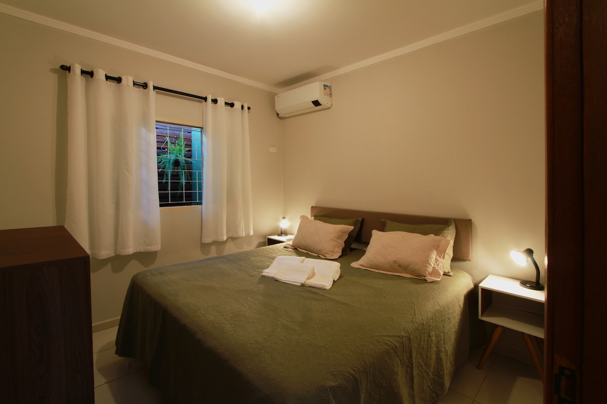ACEITAMOS PETS. TEMOS AR CONDICIONADO. ESTACIONAMENTO GRATUITO. CASA INTEIRA PARA O HÓSPEDE. Casa mobiliada completa com sala, cozinha, dois quartos, varanda, quintal e jardim. Está localizada na frente de um supermercado (é só atravessar a rua), 300 metros de padaria, 250 metros de farmácia, 3,5 quilômetros do Centro, 5 quilômetros do Aeroporto, 7 quilômetros da Rodoviária, 4 quilômetros da Feira Central, 4,5 quilômetros da UFMS e a 9 quilômetros do Bioparque Pantanal.