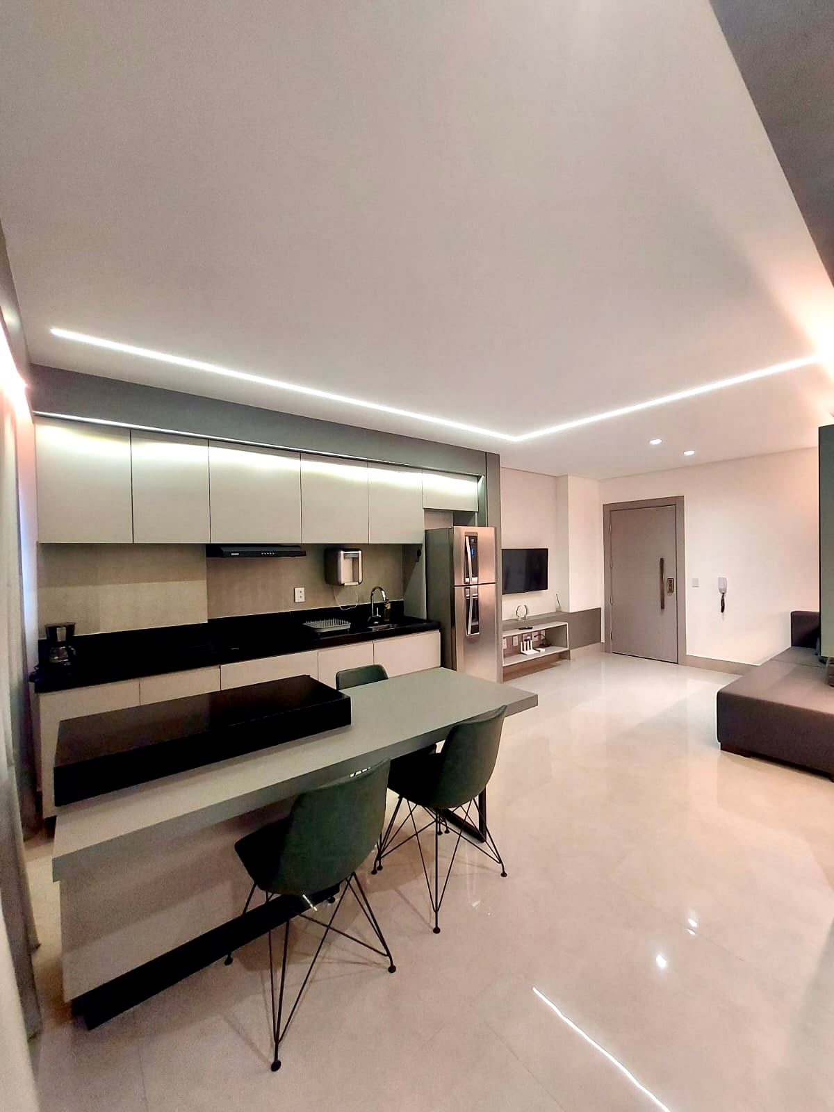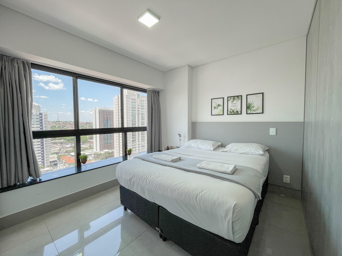 Estúdio moderno no Jardim dos Estados, com vista panorâmica e estrutura completa. Acomoda até 4 pessoas (cama queen + sofá-cama), tem ar-condicionado, Wi-Fi 300mbps, cozinha equipada, duas Smart TVs e garagem coberta privativa. No prédio: piscina aquecida, piscina com borda infinita, sauna seca, academia, coworking, salão de jogos e lavanderia (uso pago). Portaria 24h, elevador panorâmico e muito conforto em uma das melhores localizações da cidade.
