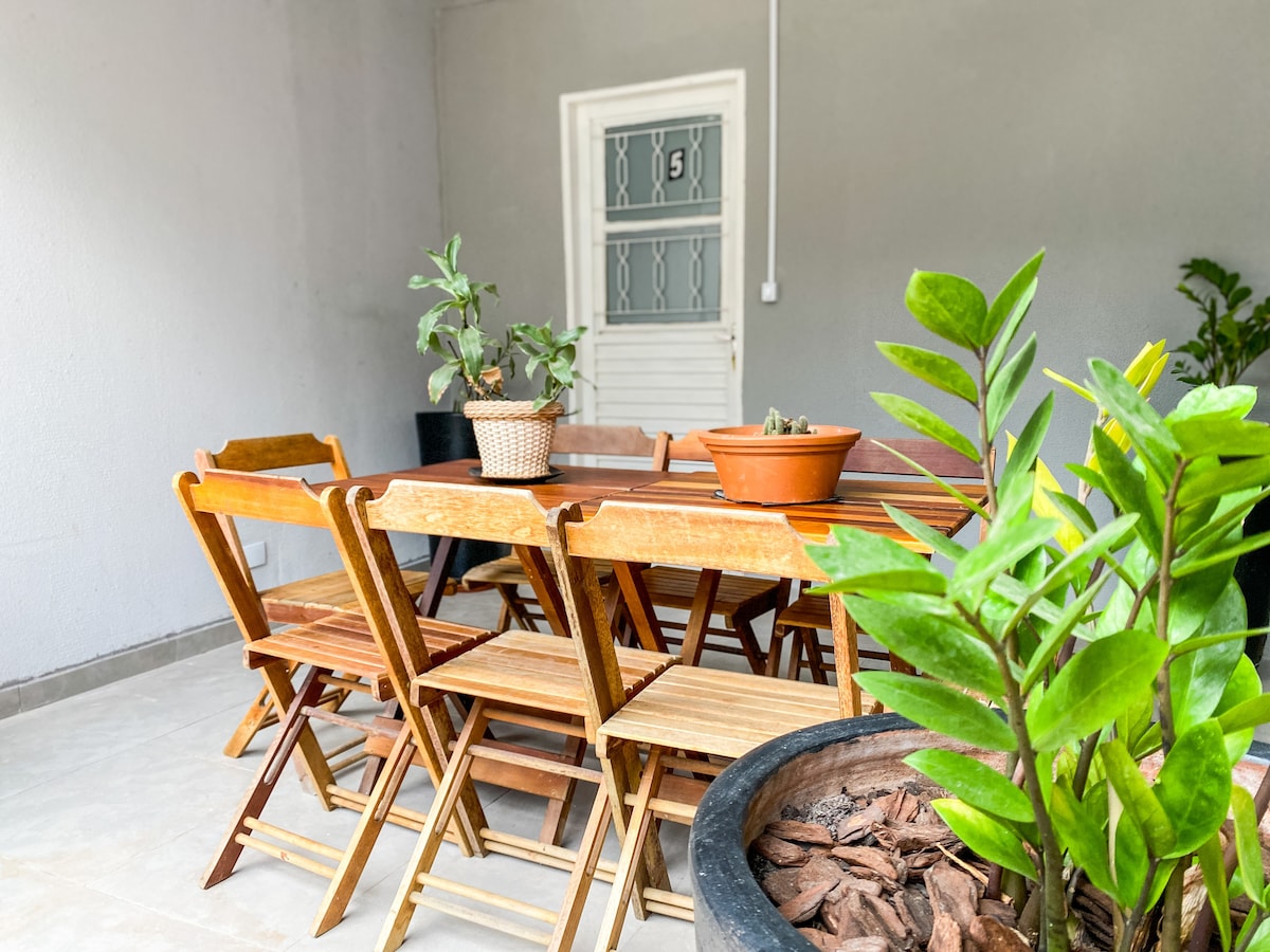 Relaxe neste lugar único e tranquilo. A antiga casa da família tem quatro quartos, sendo um externo, ótimo para se isolar e trabalhar. Varandas, duas salas, cozinha, lavanderia com máquina de lavar e dois banheiros. O melhor: 1.440 m2 de quintal com 37 árvores, sendo 21 frutíferas, que atraem pássaros. Cantinhos ao ar livre, pista de 70 m para caminhar e ducha externa. Redes sob as árvores para apreciar melhor a natureza exuberante. Pertinho de tudo que vc precisa. Um oásis em plena cidade.