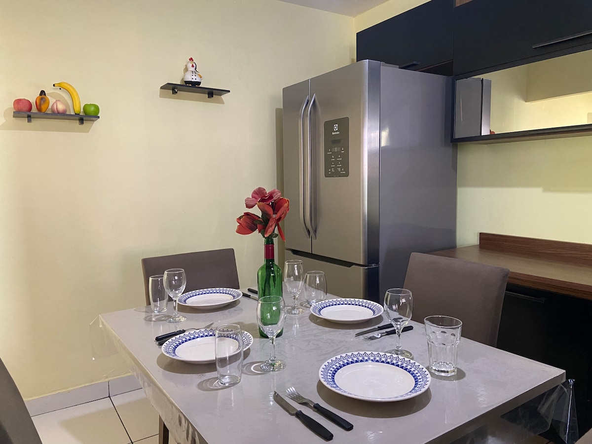 Trata-se de um loft simples, porém muito aconchegante. Possui sala ampla com sofá, televisão, cozinha equipada com geladeira, fogão, forno elétrico, airflyer, máquina café (cápsulas), liquidificador e utensílios de cozinha. banheiro social em baixo completo Ventilador de pé grande O quarto dispõe de cama King com massagem e banheiro completo armário embutido e ar condicionado. Varanda externa com rede e garagem coberta para um veículo.