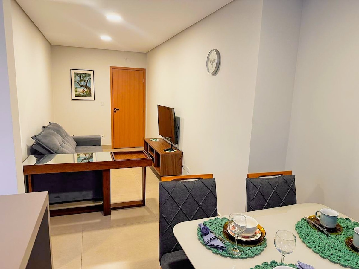 Apto Sofisticado - Novinho em folha (entregue em nov. de 2024) Design de Alto Padrão Localização Privilegiada: Bairro seguro, próximo ao centro e comércios. O que você vai encontrar: Quarto: Cama Queen com roupas de cama em algodão, para até 2 pessoas, ar quente e frio e bancada de estudos. Sala de TV: TV Smart 50”. Cozinha Completa: Eletrodomésticos e utensílios. Lavanderia: tanque de roupas Garagem: Vaga para segurança. Ideal para quem busca conforto e tranquilidade.