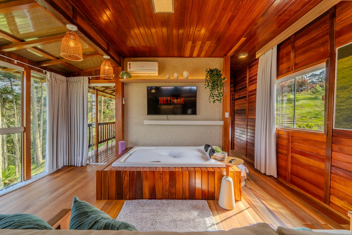 Com uma hidromassagem posicionada estrategicamente para que você desfrute de uma vista incrível das montanhas, o chalé oferece o cenário perfeito para relaxar, celebrar o amor e se reconectar com a natureza. O ambiente combina charme rústico com toques modernos, criando um clima acolhedor e intimista. Grandes janelas permitem que a luz natural invada o espaço e destacam o espetáculo da paisagem a qualquer hora do dia — seja no nascer do sol, entre as nuvens da tarde ou sob o céu estrelado.