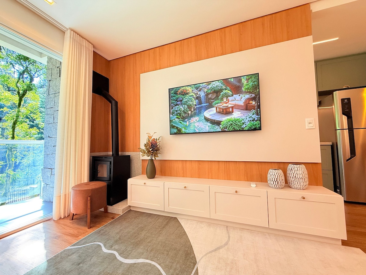 ✨ Flat/Suíte de Alto Padrão no Laje de Pedra – Canela/RS Aconchegante flat para até 5 pessoas, com quarto de casal, sala ampla com dois ambientes, lareira, sofá-cama, recamier e mesa de jantar. Cozinha completa. Banheiro com duas cubas e banheira de hidromassagem. 🌲 Localizado no Mountain Village, dentro do icônico Condomínio Laje de Pedra, com linda vista para um bosque de araucárias. Um refúgio de conforto, charme e natureza na Serra Gaúcha.