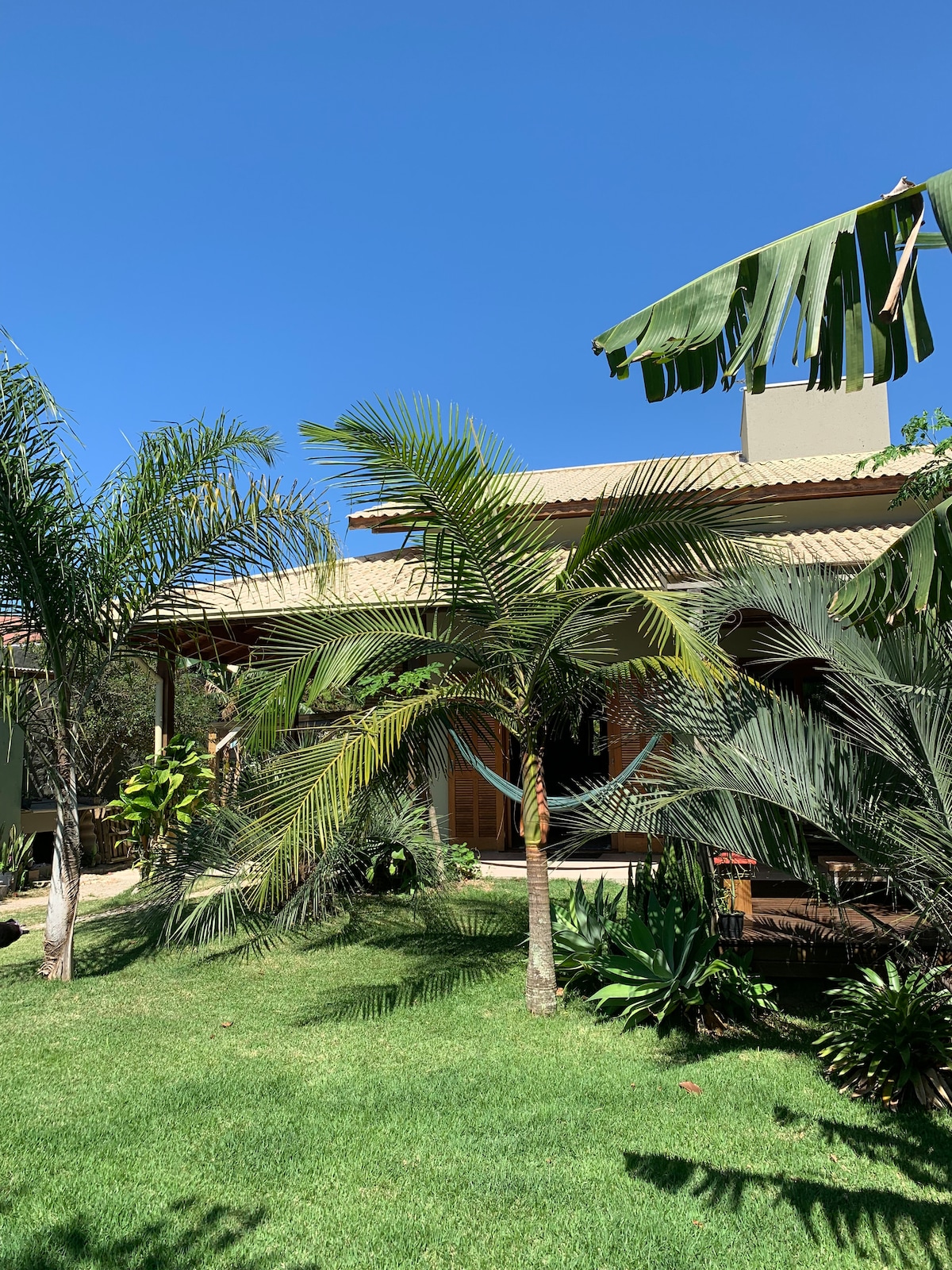Casa ampla com 3 dormitórios. Primeiro quarto: 1 suíte com cama baixa queem, armário, ar condicionado. Segundo quarto com cama casal, armário e ar condicionado. 1 banheiro social. Segundo andar: mezanino com sofá cama e smart tv. Terceiro quarto com cama de casal queem, armário e ar condicionado. Sala e cozinha conjugada. Área externa com churrasqueira, redes, sofás rústicos para relaxar. Um banheiro sem chuveiro. Jardim, ducha externa. Estacionamento.