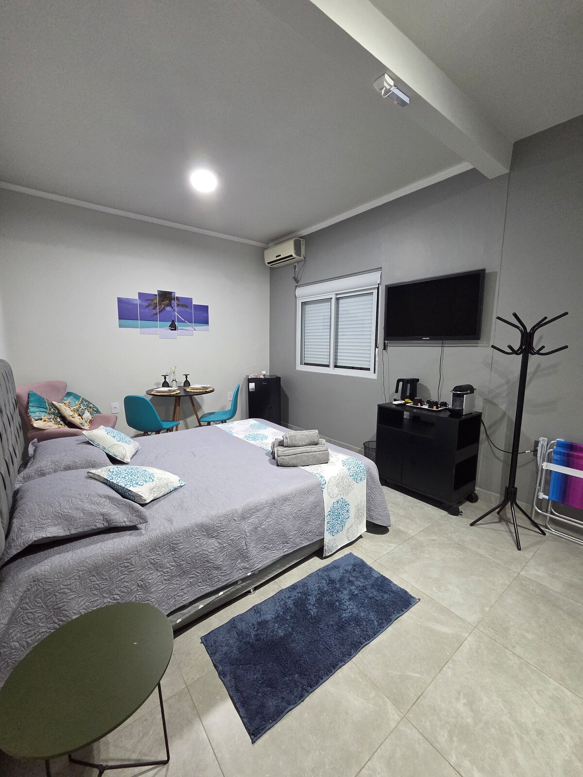 É um espaço excelente para passar a noite, descansar, após um dia de trabalho, passeio ou passagem pela cidade! Possui uma cama de casal, tv, wi-fi, frigobar, utensílios de cozinha, toalhas de banho e rosto, jogo de cama completo e um cobertor e com entrada independente da casa. Ele faz parte da casa principal mas você estará isolado e independente da casa principal! IMPORTANTE: - Não há vaga de garagem. - Visitas NÃO são permitidas. - Tem escada. - Não é permitido a troca de hóspedes.