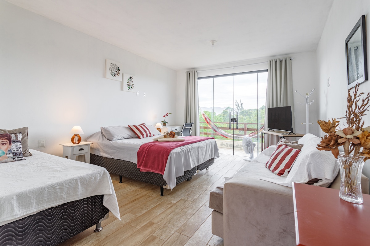 Nosso segundo cantinho está pronto para receber até 4 pessoas e foi preparado com muito carinho. Temos uma cama de casal, uma cama solteiro e um colchão bicama a disposição e com total privacidade. Ideal para famílias com crianças. Além do quarto e banheiro, temo uma cozinha compacta a disposição com frigobar, cafeteira, sanduicheira e alguns itens básicos para o preparo de lanches e refeições rápidas.