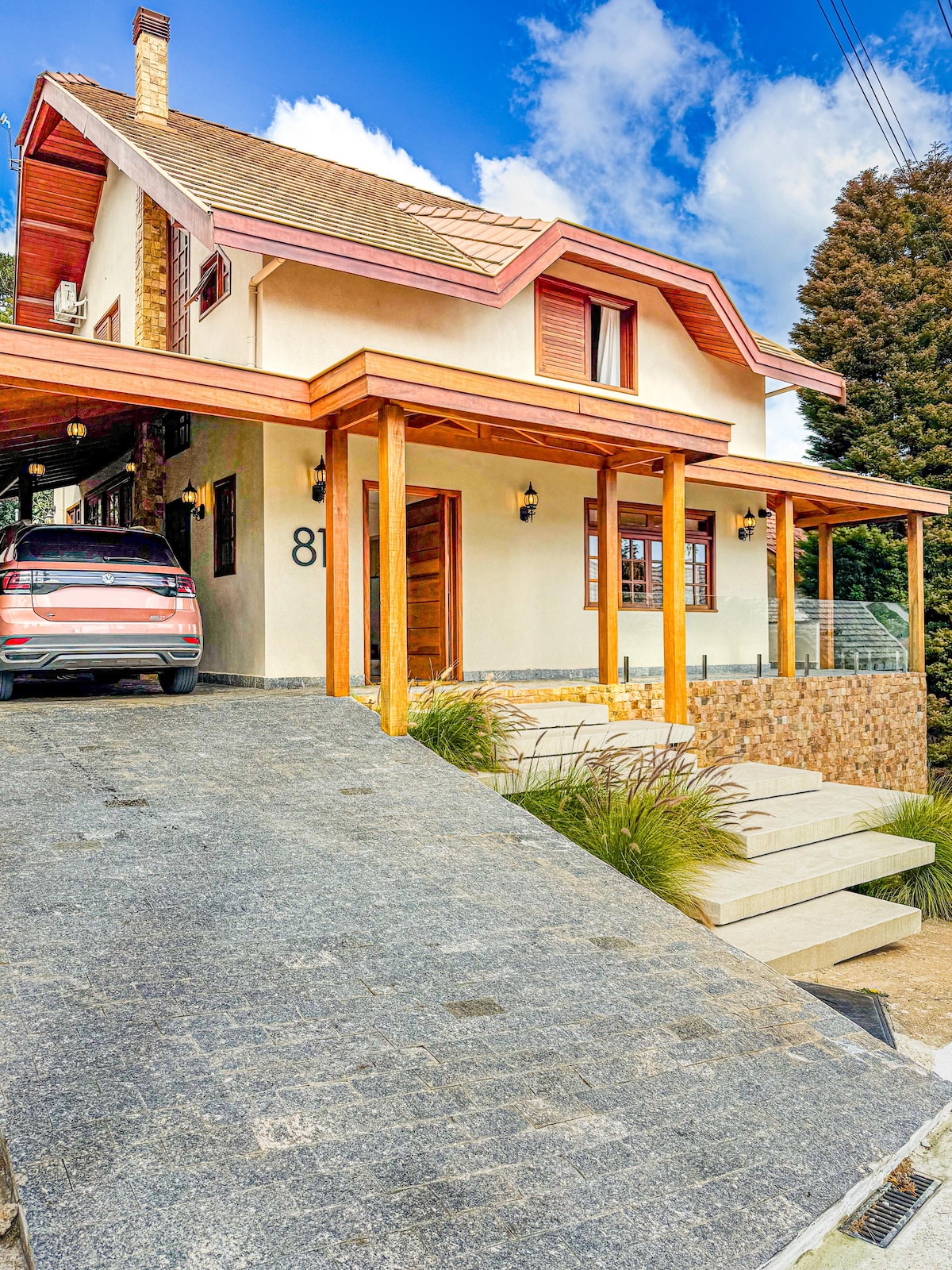 Casa super aconchegante, ideal descansar e curtir natureza com família e amigos. Condomínio fechado com segurança 24 horas. 5 suítes + escritório, vista espetacular, deck de 110m2 sobre vale araucárias; area gourmet coberta, churrasqueira, forno pizza. Jardim lindo com araucarias, pinheiros e árvores frutíferas. Somente 4km centrinho de Capivari; estrutura para home office com WIFI fibra ótica, tv cabo SKY; garagem para 6 carros. indicamos serviço diarista/cozinheira/pizzaiolo/churrasqueiro