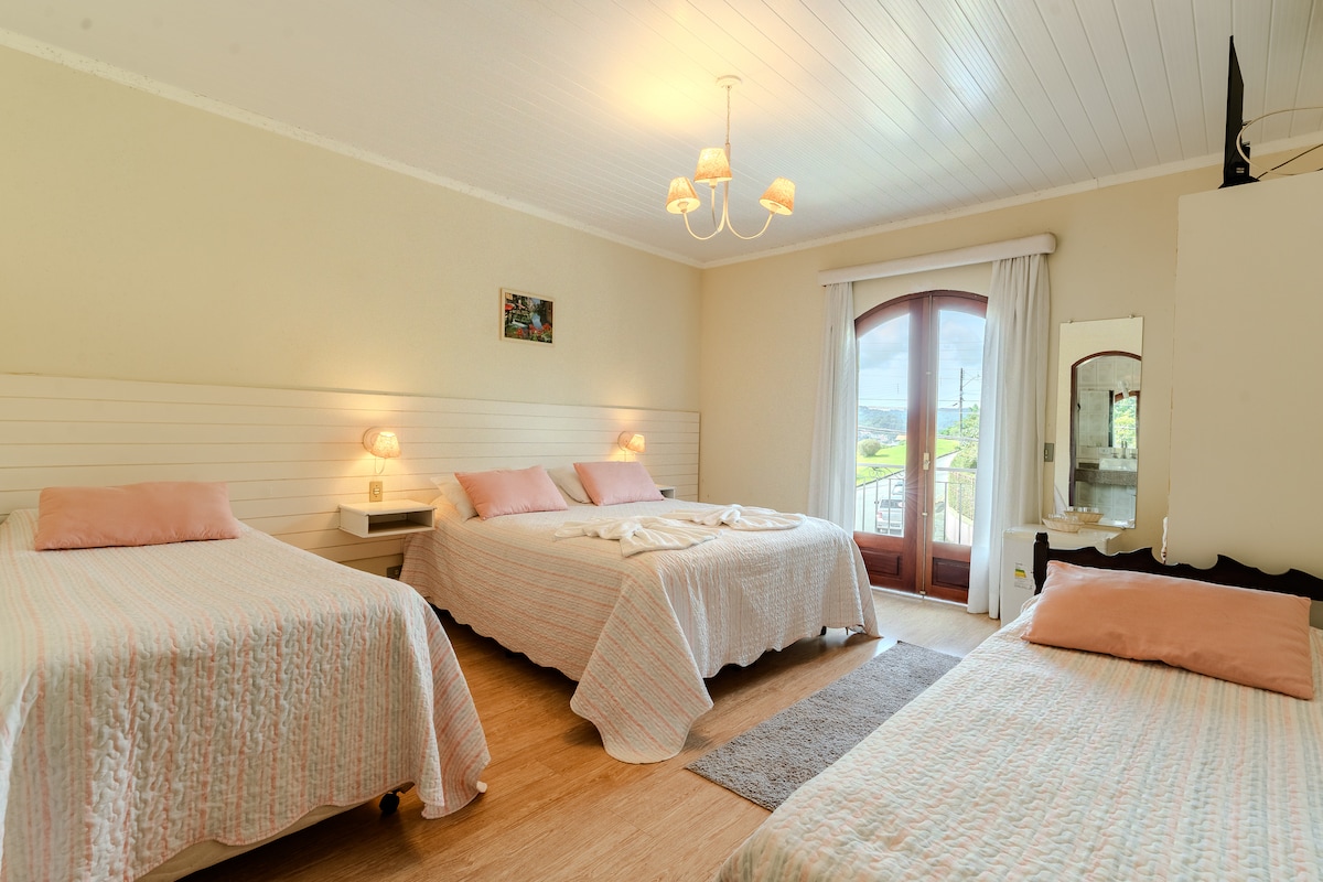 Suíte privativa com 1 cama de casal e 1 cama de solteiro, banheiro privativo, vista panorâmica e sacada.