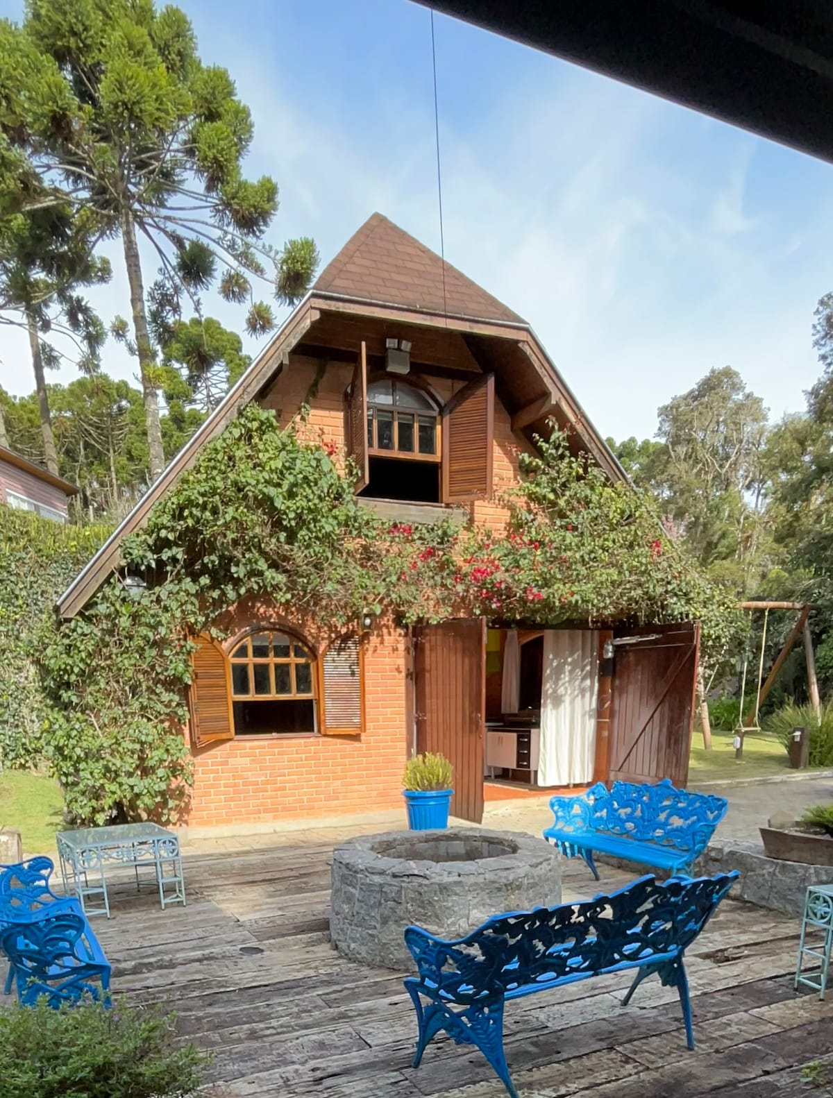 Pensa em uma cabana num Jardim. Com charme, aconchego..e um amor! Sim, esse lugar é aqui e o amor você pode trazer. A cabana é de madeira, lareira de pedra. Aquece e proporciona uma noite romântica, experiência incrível! Taças para vinho e aparelho de fondue estão aqui para isso. Espreguiçadeiras no sol, pequeno deque e um recanto com rede e balanço no jardim. Estamos em meio à natureza e muito perto do agito do centrinho é só escolher!