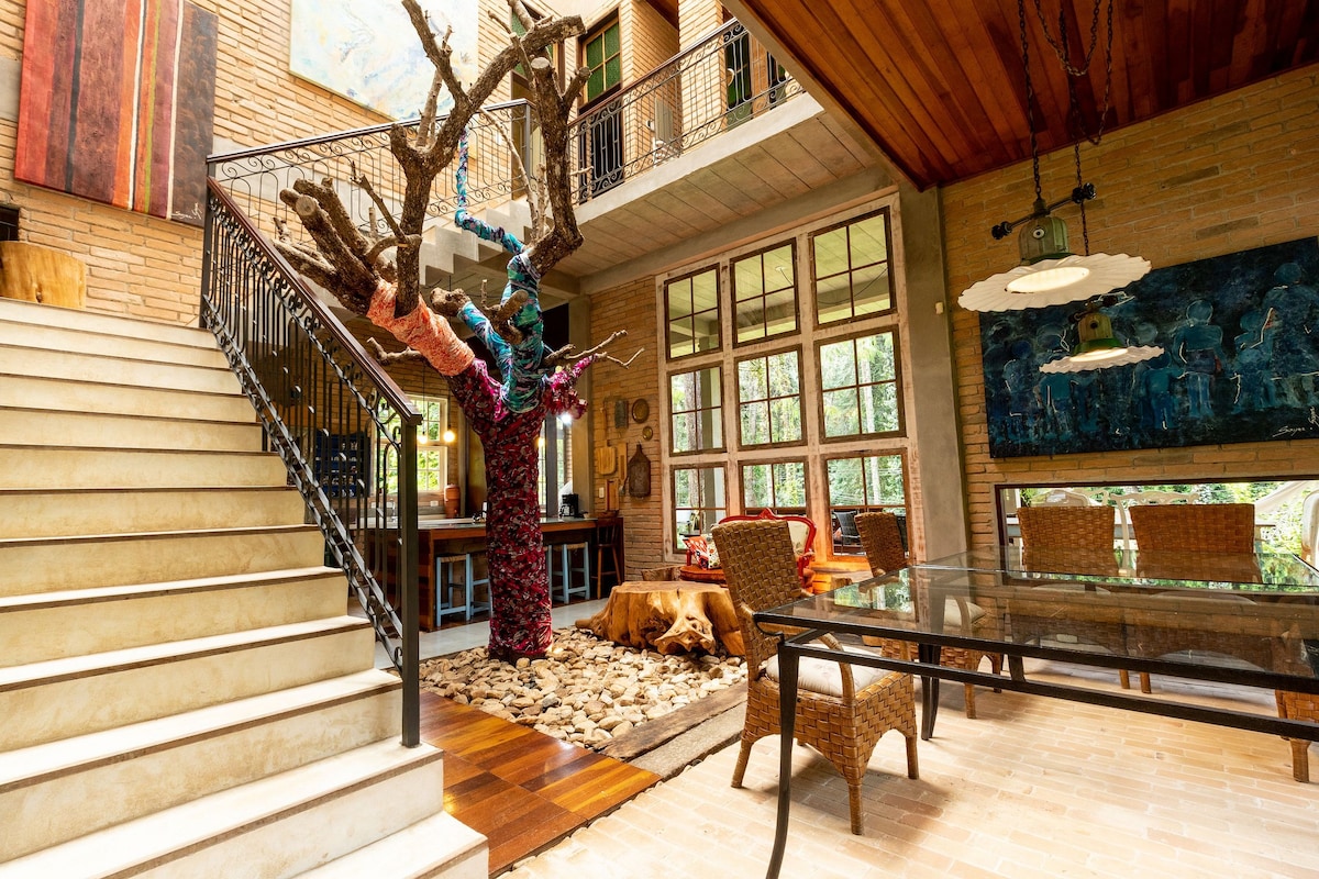 House with 3 comfortable upscale condo suites with tennis courts , playground and security 24 hrs . It has 3 comfortable suites with electric heaters, 2 rooms with fireplace, kitchen with integrated equipped gourmet area with pizza oven , wood stove and barbecue. panoramic view of the woods entitled to monkeys nearby.