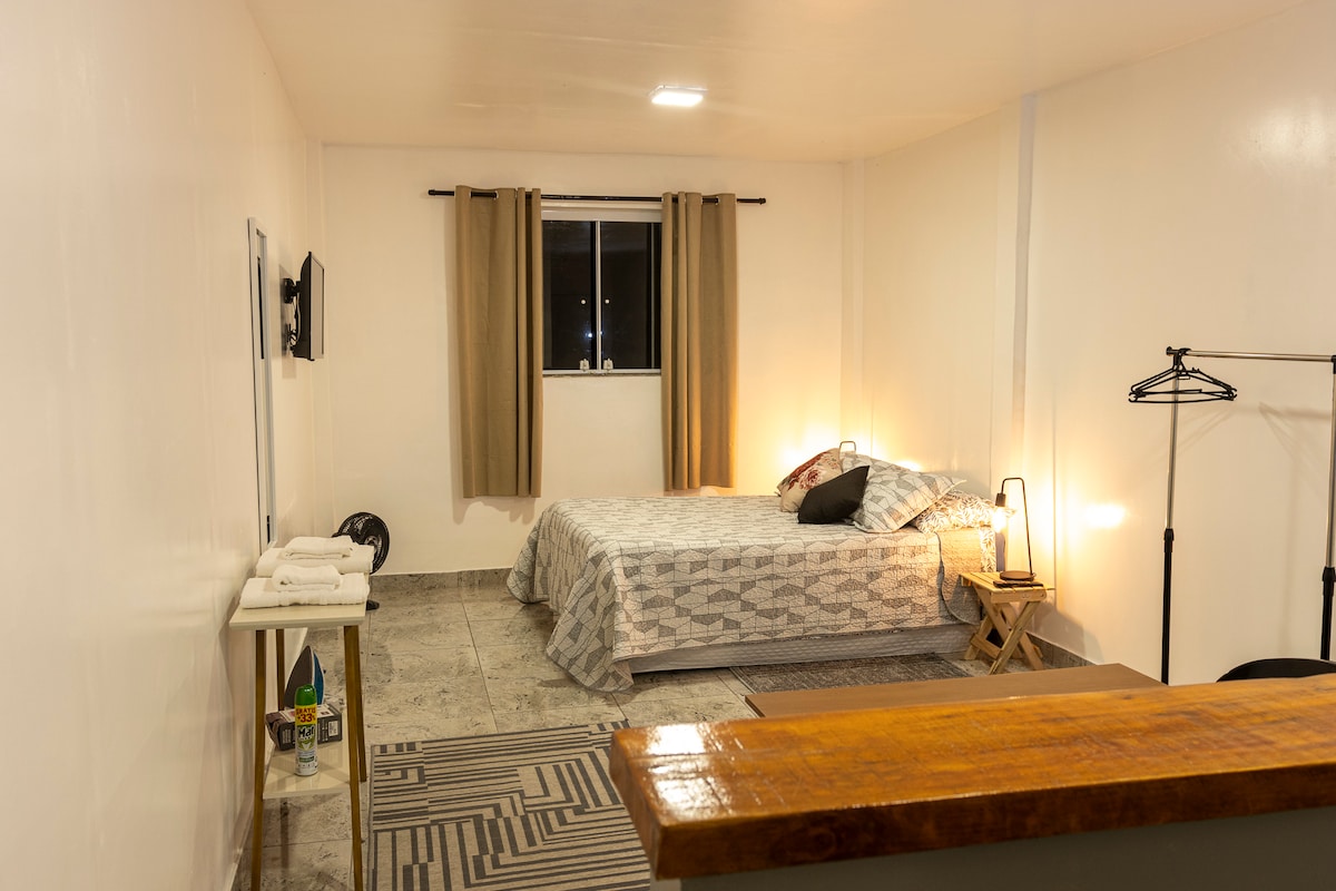 Unidade exclusiva da @hospedacamposdojordao, com tudo o que você precisa para sua estadia ser perfeita em Campos do Jordão. Cama Kingsize com aquecimento para os dias frios. Móveis modernos, com tapetes de ovelha decorando os ambientes. Estação de café, chás e biscoitos amanteigados cortesia. Cozinha Brastemp equipada para quem gosta de cozinhar. Nossa localização é estratégica, a alguns minutos de caminhada do centrinho turístico, e outras diversas atrações turísticas.
