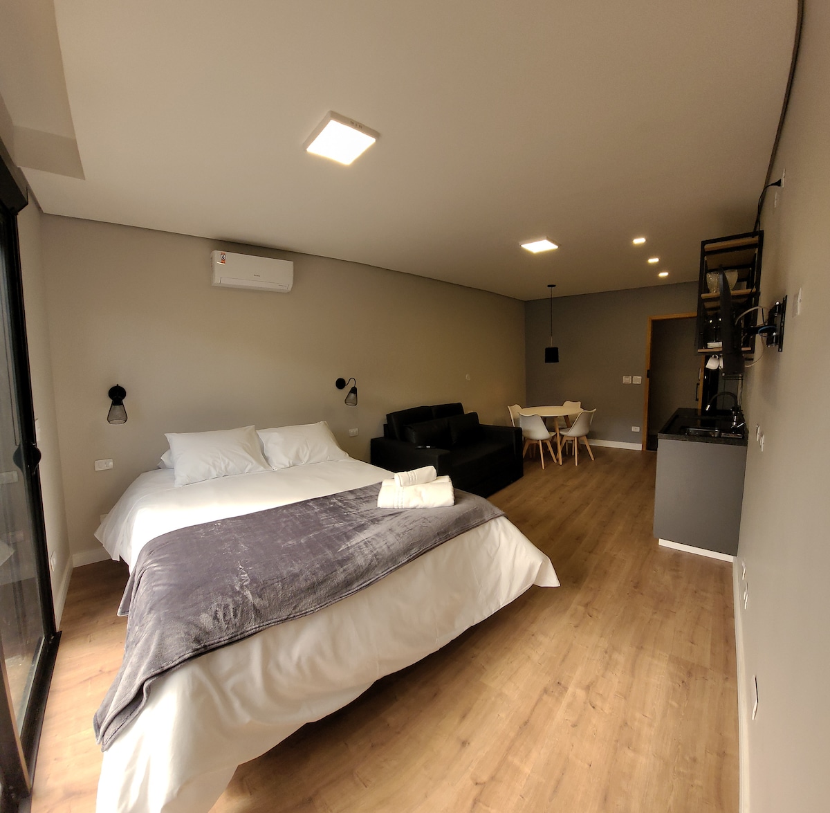 Nosso estúdio novo e moderno está localizado no coração do centro turístico do Capivari, composto por 1 suíte e 1 quarto suspenso com 1 cama de casal em cada para casais e famílias. Contamos com uma pequena sala de estar e cozinha equipada. Disponibilizamos roupa de cama e banho completo. Temos estacionamento cortesia no local. Disponibilizamos de internet wi-fi e possuímos TV smart. Contamos também com uma sala de estar de uso comum com lareira e jogos.