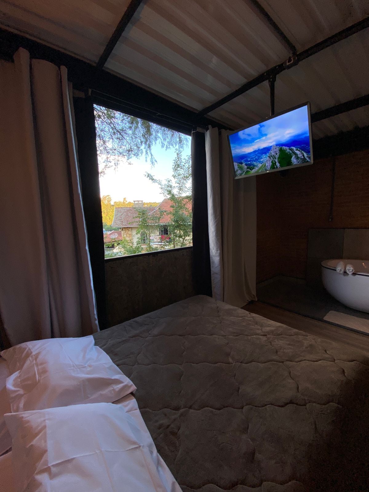 Aconchegante e com vista deslumbrante, a suíte tem estilo sem igual, perfeita para um fim de semana romântico. Como anexo à casa principal, tem entrada exclusiva e toda privacidade. Desfrute do amplo quintal com lounge exclusivo, redário, espaço para fogueira e garagem. Com cafeteira, chaleira, taças e abridor de vinho. Sem frigobar. Caso deseje cozinha, temos a “Casa Vista e Design” que dispõe de sala, cozinha e acomoda até 4 pessoas ;) Nossas 2 cadelas super mansas moram na propriedade*