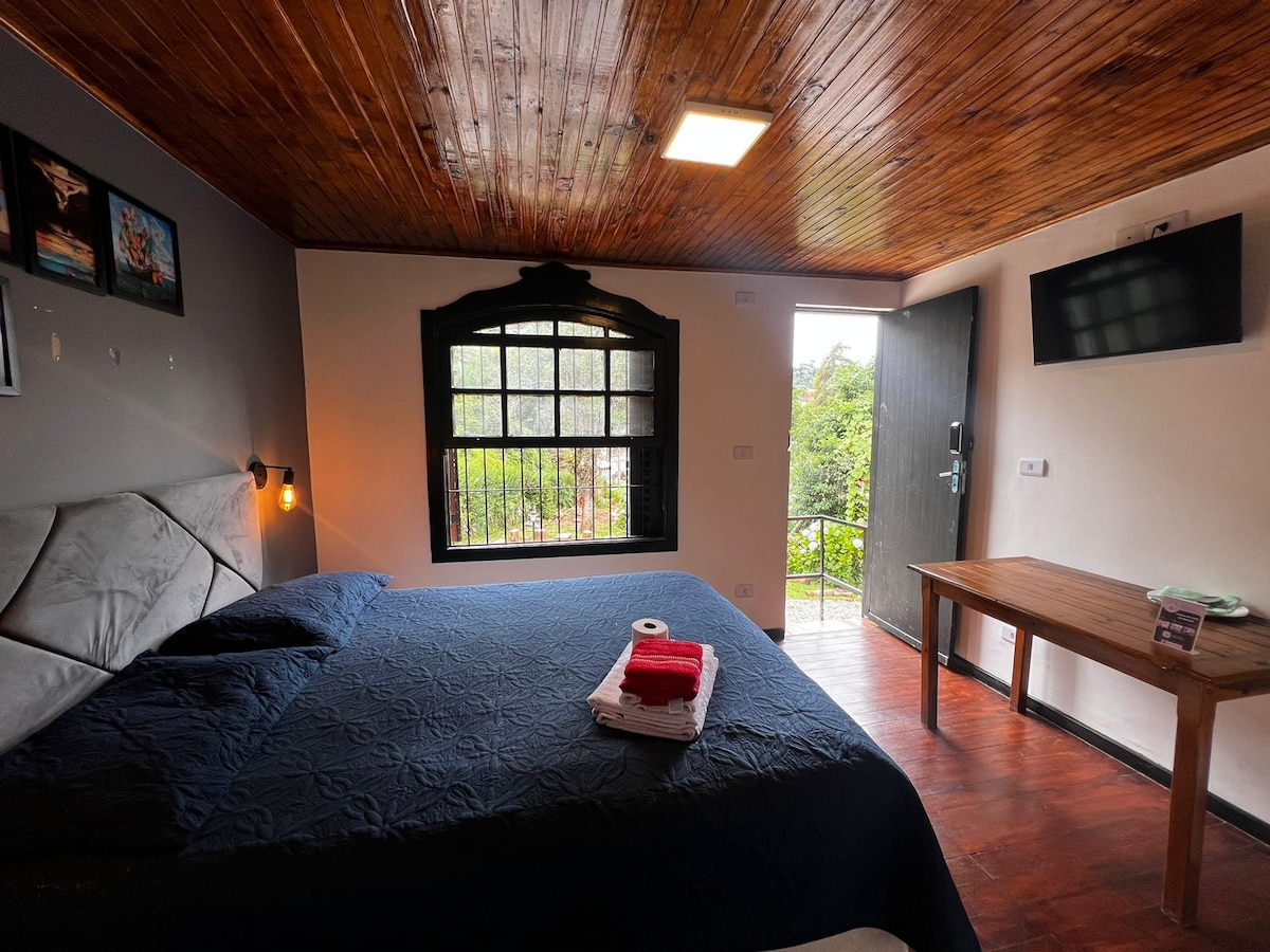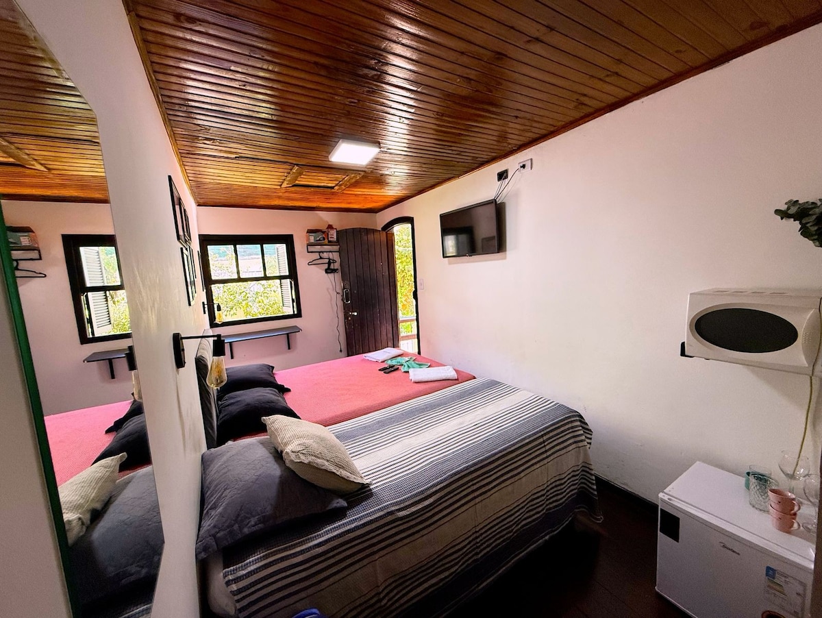 Confortável suíte/estúdio, 28 m2, com entrada independente da casa e linda vista. Espaçosa, acomoda confortavelmente até 4 pessoas. Conta com infraestrutura para o preparo de pequenas refeições. Roupa de cama e banho, além de cobertores e edredons, perfeitamente higienizados. Internet com fibra ótica de alta velocidade. Tv com 80 canais. Localizada no Alto do Capivari, cerca de 2km e meio, do centro turístico. Acesso fácil, com apenas 600mts em rua de terra batida, saindo do asfalto.