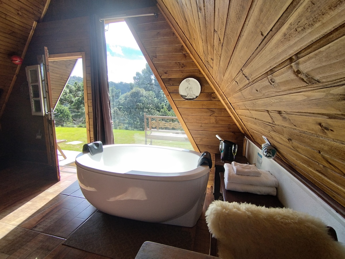 Cabana (privativa) de 72 m2 (Estilo A-frame) com 2 quartos, vista incrível. NÃO SERVIMOS CAFÉ DA MANHÃ NÃO ACEITAMOS PETS NÃO ACEITAMOS CARROS ELÉTRICOS ✔ Lareira ✔ TV Smart 40" ✔ WIFI ✔ Mesa para home office ✔ Cozinha ✔ Água quente na cozinha e banheiro ✔ Berço ✔ Cafeteira Nespresso ✔ Secador de Cabelo ✔ Aparelho de Foundee ✔ Alexa ✔ Hidromassagem com cromoterapia na frente da cabana em vidro Área externa: ✔ Área Gourmet c/ Churrasqueira, pia e mesa ✔ Fogueira ✔ 1 Pergolado ✔ Estacionamento