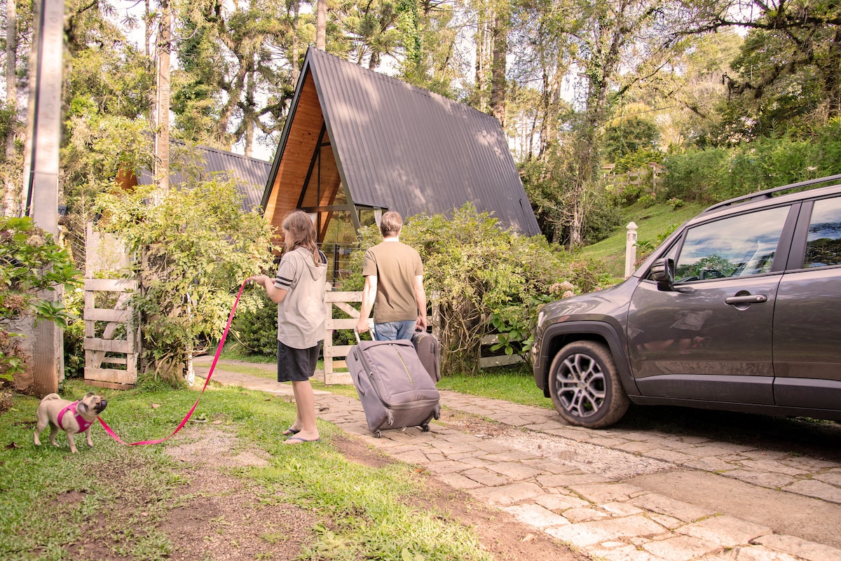 Cabana (privativa) de 72 m2 (Estilo A-frame) com 2 quartos, vista incrível. NÃO SERVIMOS CAFÉ DA MANHÃ NÃO ACEITAMOS PETS NÃO ACEITAMOS CARROS ELÉTRICOS ✔ Lareira ✔ TV Smart 40" ✔ WIFI ✔ Mesa para home office ✔ Cozinha ✔ Água quente na cozinha e banheiro ✔ Berço ✔ Cafeteira Nespresso ✔ Secador de Cabelo ✔ Aparelho de Foundee ✔ Alexa ✔ Hidromassagem com cromoterapia na frente da cabana em vidro Área externa: ✔ Área Gourmet c/ Churrasqueira, pia e mesa ✔ Fogueira ✔ 1 Pergolado ✔ Estacionamento