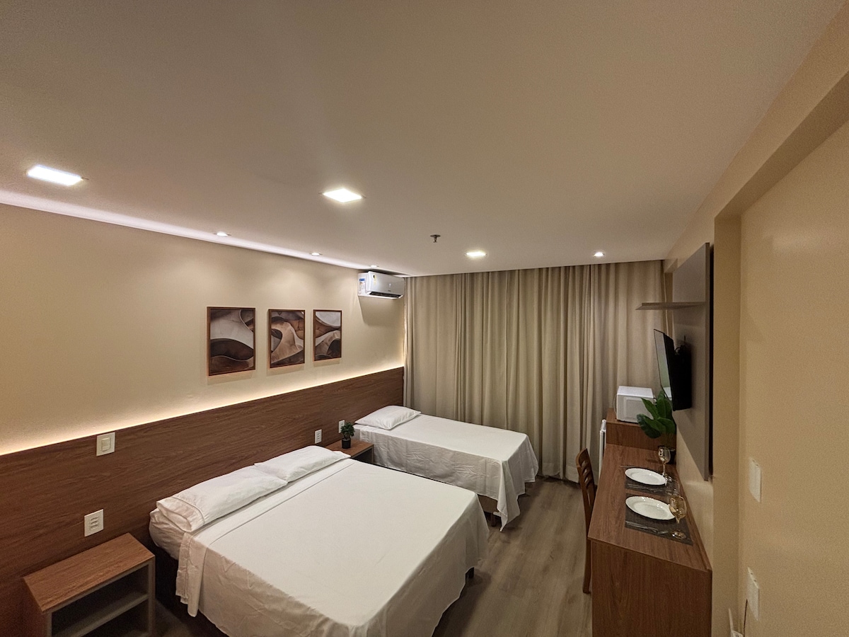 Venha desfrutar de uma estadia tranquila, e agradável, no nosso Stúdio. Um espaço aconchegante, e acolhedor, ideal para viagens a trabalho, negócios, e lazer. Localizado em um bairro tranquilo, há poucos minutos da principal Av. da Cidade. Nas proximidades você encontra tudo que precisa, casa lotérica, supermercado, padarias, farmácias, etc. Oferecemos roupa de cama e banho, em algodão, tv, wi fi, ar condicionado, etc. Venha conferir. É proibido fumar dentro do espaço.