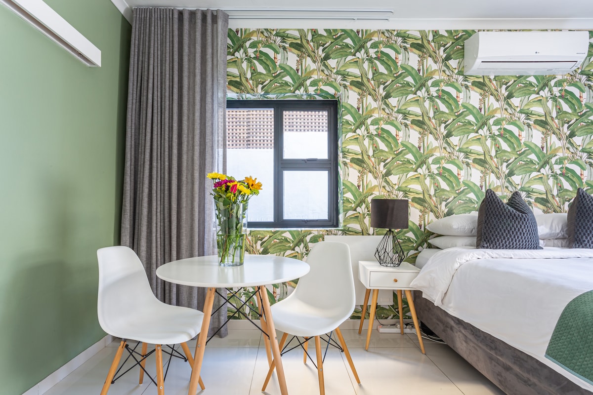 Unwind on the poolside loungers after a busy day exploring and enjoy the view of Table Mountain. This spacious modern studio looks out onto your own exclusive use luxurious private pool patio. Go for a morning stroll along the beach, just 100 meters away. Use the study desk area indoors, or the large poolside table outside on the sheltered patio to work remotely with our high speed Fiber. The studio has backup lighting, air conditioning, Netflix and your own gated parking bay.