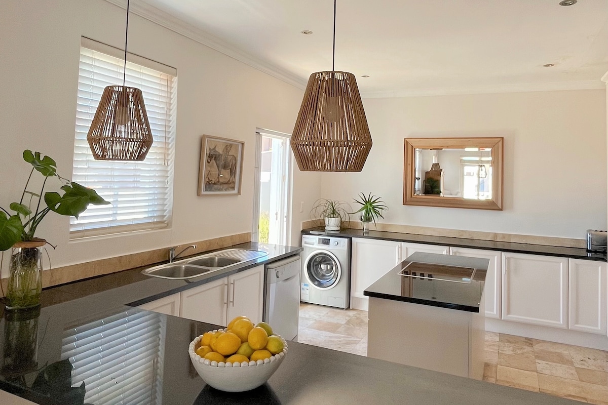 Lounge by the pool of this farm-style villa surrounded by lush green garden. The homestead offers a number of cosy nooks, including a peaceful backyard patio, a plush living room & bright sun room. The three bedroom, three bathroom layout makes spacious, relaxed easy living for 6. It's packed with amenities & a secure off street parking. The Fibre WiFi is super fast & reliable. An Inverter provides Electricity during LoadShedding for lights, Wifi, TV, Fridge and a Phone/Computer Charging Socket.