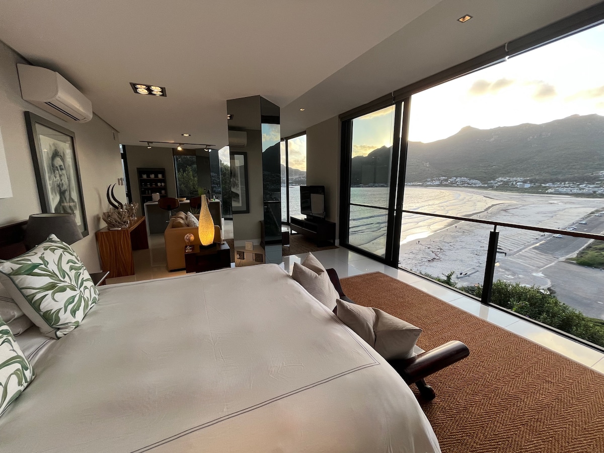 Our studio apartment opens up onto a 40sq meter balcony with a panoramic view of the Hout Bay Valley and the Helderberg mountains beyond. Large sliding doors disappear into the walls creating an unimpeded indoor/outdoor flow while the elevated position protects your privacy. The open plan bathroom faces onto an enclosed secret garden which includes a frame-less glass shower. The unit has a fully equipped kitchenette and is serviced daily except weekends and public holidays.