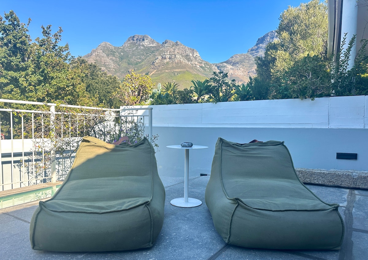 We can't wait to welcome you to our gorgeous home in magnificent Camps Bay! All rooms open onto a garden with a sea view. Use of pool and under cover entertainment area. Fully equipped kitchen. Child friendly and pet friendly. Secure parking for one car in garage. Also roadside parking. Store room. Private entrance. Safe neighborhood. Quiet cul de sac road. Long or short term lease. Very secure.