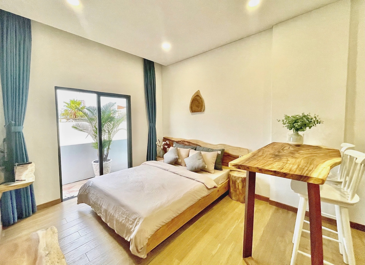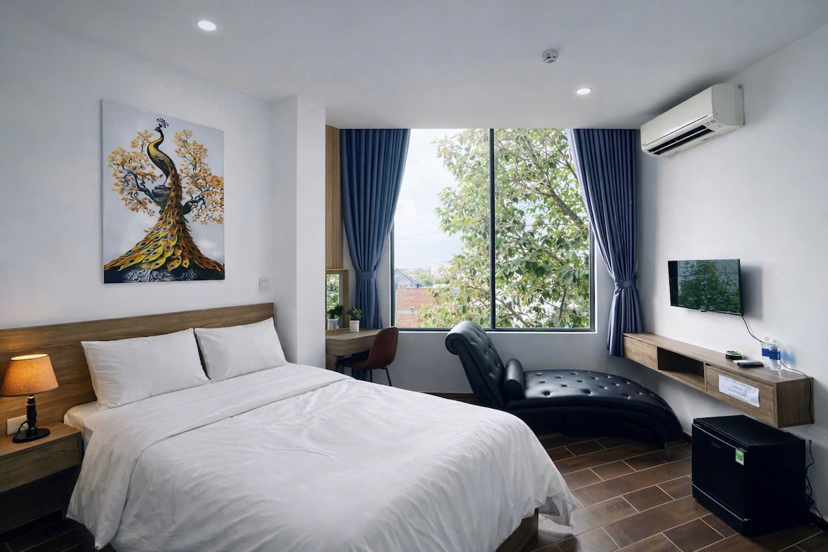 Phòng thiết kế hiện đại, sạch sẽ, tông gỗ ấm áp. Trang bị 1 giường đôi lớn, máy lạnh, TV màn hình phẳng, bàn làm việc, tủ quần áo, tủ lạnh mini, rèm cản sáng. Phòng tắm riêng có vòi sen nước nóng, khăn tắm và đồ dùng cá nhân đầy đủ. Phù hợp cho 2 khách, nghỉ dưỡng hoặc công tác.