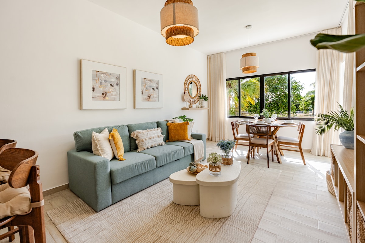 Discover comfort in our Punta Cana apartment. Sleeps 3 with a queen bed & plush couch bed. Full kitchen, washer/dryer, and high-end handmade furniture for an exquisite stay. Your tranquil getaway is here. - Enjoy access to an on property private pool suitable for both adults and kids. - Private beach club just a minute away by car or 5min walking. (Beach club does require a $25- $40fee, however that will be deducted from your bill at the private beach club restaurant and or bar)