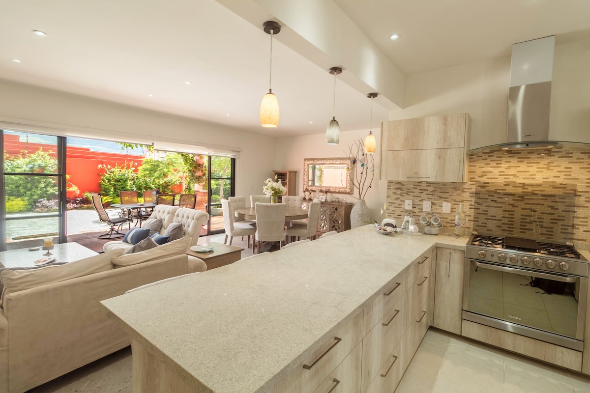 Enjoy the spaciousness and design of our 4-bedroom home, perfect for large groups and families. Impeccable cleanliness and comfort at every corner. Located in a secure and convenient neighborhood, with a garage for two medium-sized cars, you can reach downtown in just 5 minutes. Fully equipped, it includes a large and well-furnished kitchen. The decor reflects Mexican charm. An outfitted terrace for socializing. Each room has its own bathroom and walk-in closet.