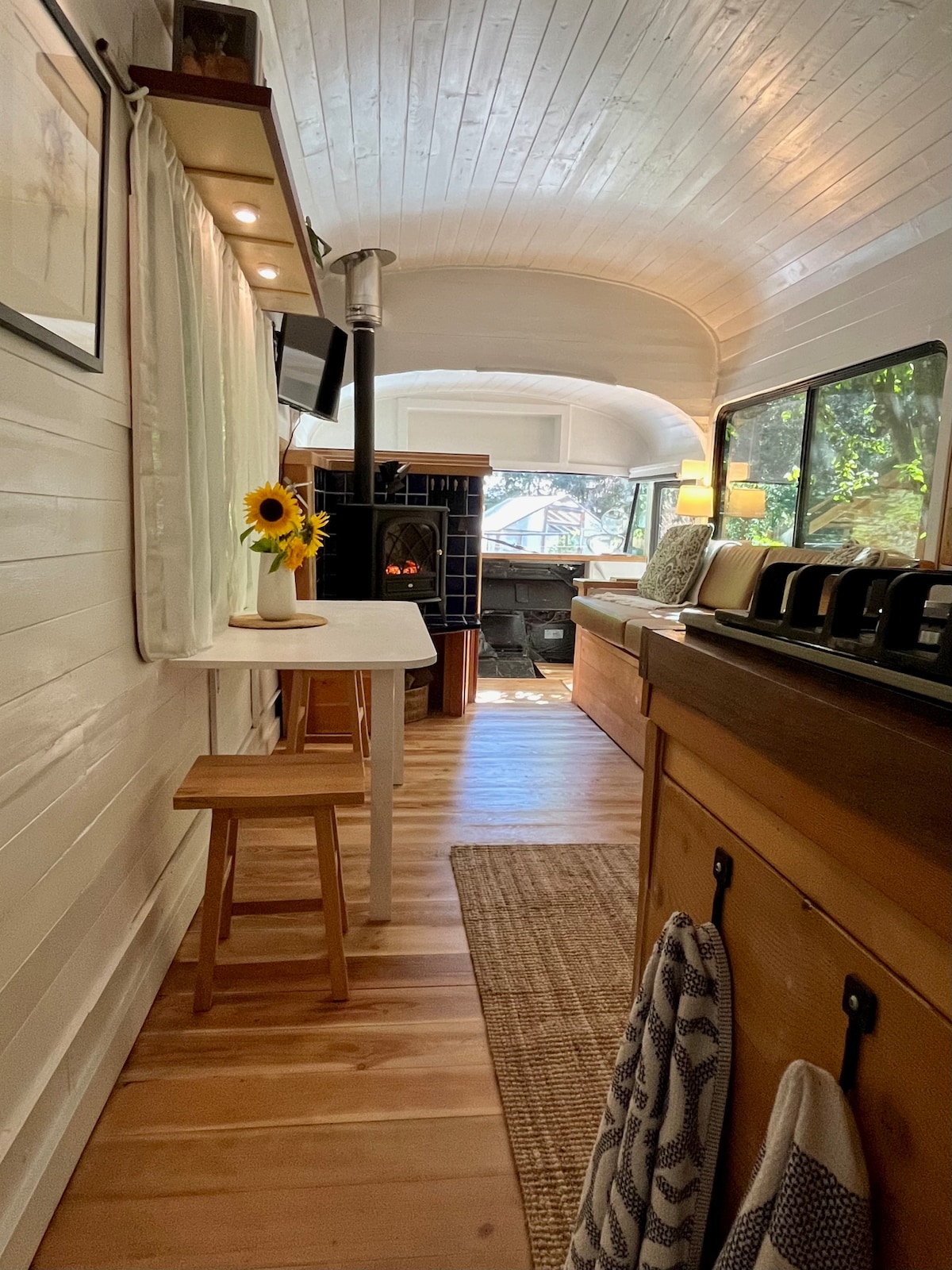 明亮的巴士改装房,配备燃木炉,可欣赏海景