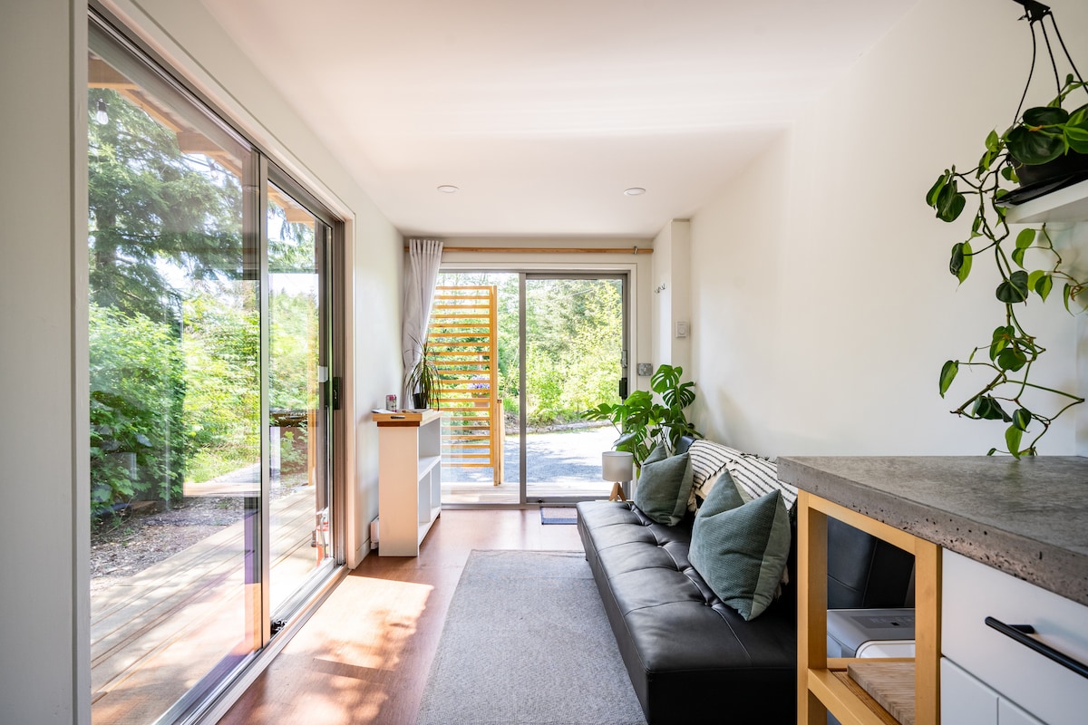 A perfect ocean-side Suite & Sauna tucked in the trees and ferns at the end of a quiet culdesac. The newly built shipping container suite design is modern, light, clutter-free, clean, and features a Sauna / Warm Room. An ideal stay for one or two guests. Stay in and relax, or walk down the trail through the forest will find you at the ocean where you can watch the waves, sunsets or continue walking up to China Beach. The location is quiet, safe, and comfortable.
