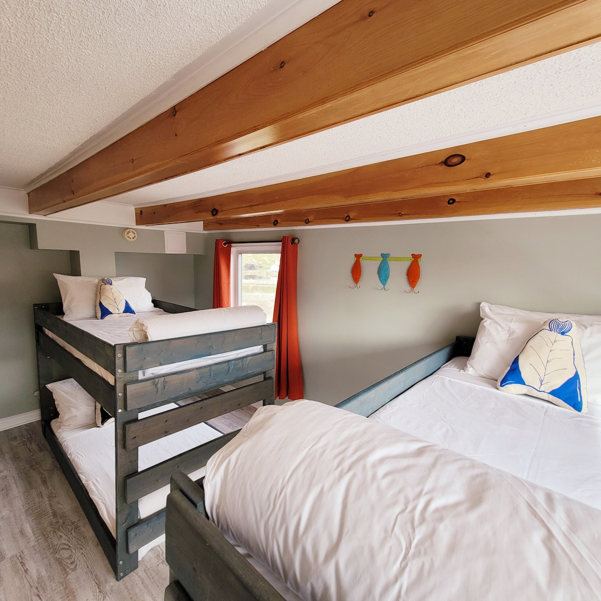 Breakfast is available from 7am to 930am must be booked 24 hours in advance, coffee/tea full breakfast $15 + HST Included in your stay is a FREE Algonquin Park Day Pass ($21 per day savings) We are featuring Room 4 which has one double bed, one bunk bed and a window looking out at the Madawaska River . This is your private room. You will be sharing with other people a fully equipped kitchen, two bathrooms, TV room with satellite television, outdoor BBQ, fire pit, picnic tables and WiFi.