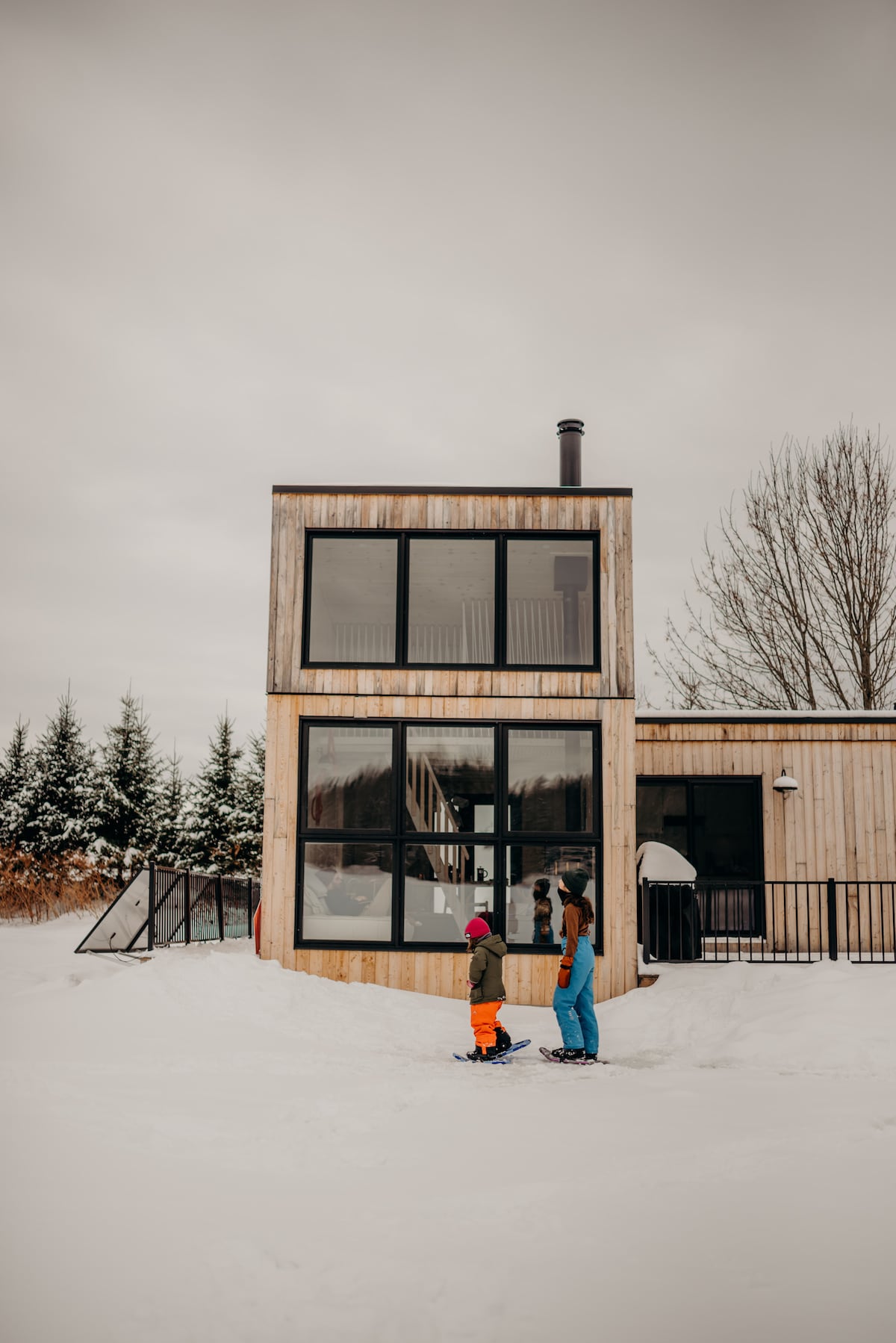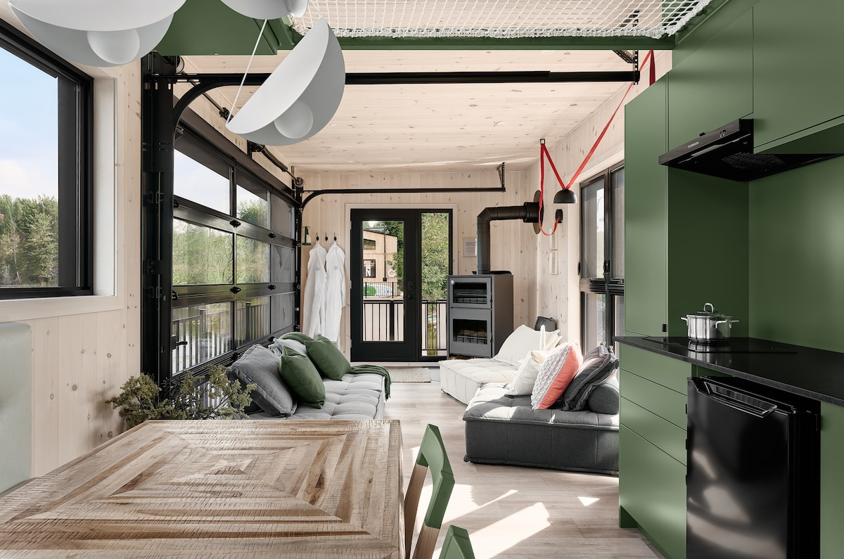 Floating Cabin — Minibora Le bolet (Maximum 4 Guests) A Bright and Inviting Living Space: - Glass garage door for an immersive waterfront experience - Fully equipped kitchen and private BBQ Sleeping Arrangements: - Open-concept bedroom with a double bed - Modular sofas: 2 single beds or 1 double bed Included: - Firewood - Locally roasted coffee - 11 Comtés craft beer - Paddleboards and kayaks in summer - Snowshoes in winter Dog-friendly (extra fee) CITQ: 302677