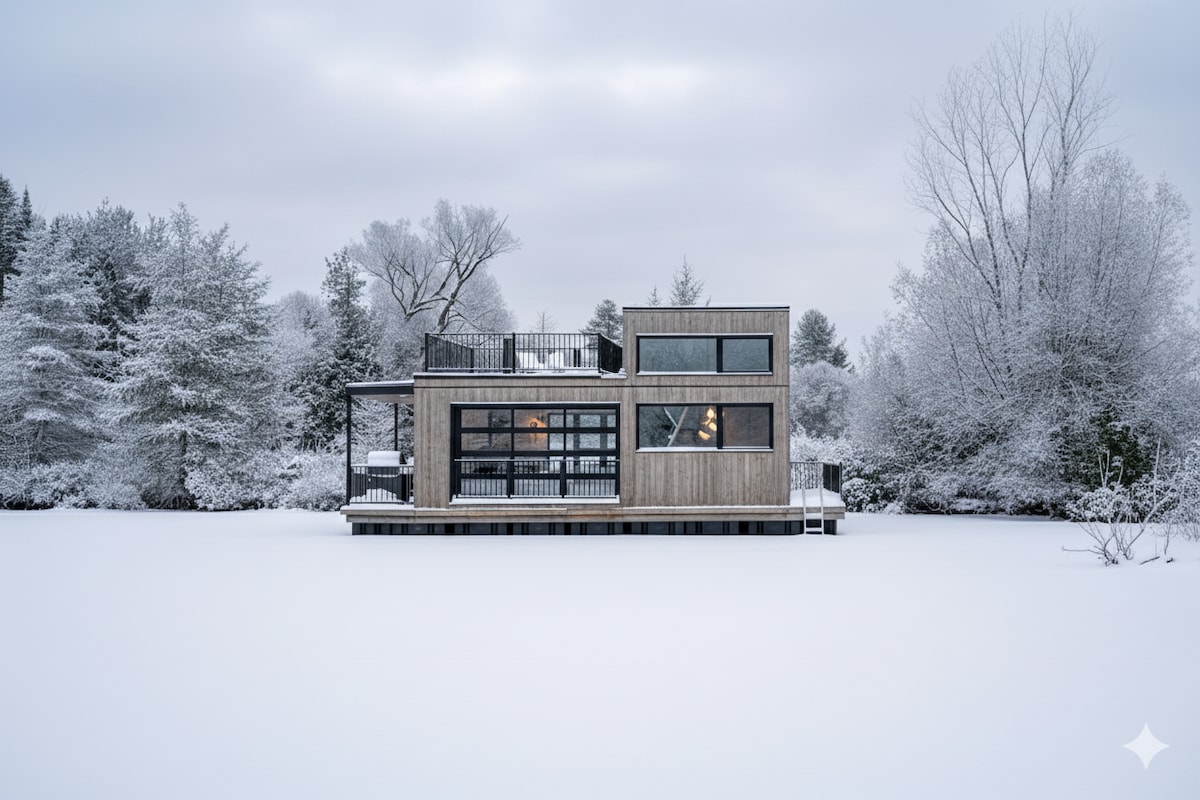 Chalet flottant — Minibora Le nénuphar (4 personnes maximum) Un espace de vie lumineux et convivial: - Porte de garage vitrée offrant une immersion au niveau de l’eau - Cuisine équipée et BBQ privé Couchages: - Chambre à aire ouverte avec lit double - Sofas modulaires: 2 lits simples ou 1 lit double Inclus: - Bois de chauffage - Café de torréfacteur local - Bière de microbrasserie - Planches à pagaie et kayaks en été - Raquettes en hiver Chiens bienvenus ($)
