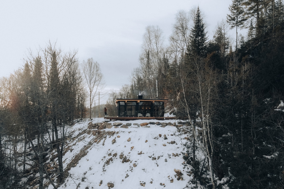 Contact us for our ongoing Promotion! Secluded Architect Glass Cabin perched for breathtaking Mont-Tremblant mountains views! Klint Tremblant (Cliff in Danish) is the unique design so you can retreat to comfort and luxury. It is a majestically glazed architectural space combining natural simplicity & contemporary luxury, 10 min from village Mont-Tremblant & Panoramic terrace & Private Hot tub In Laurentian. Designed by Canadian famous Designer in shared domain of 1200 Acres!