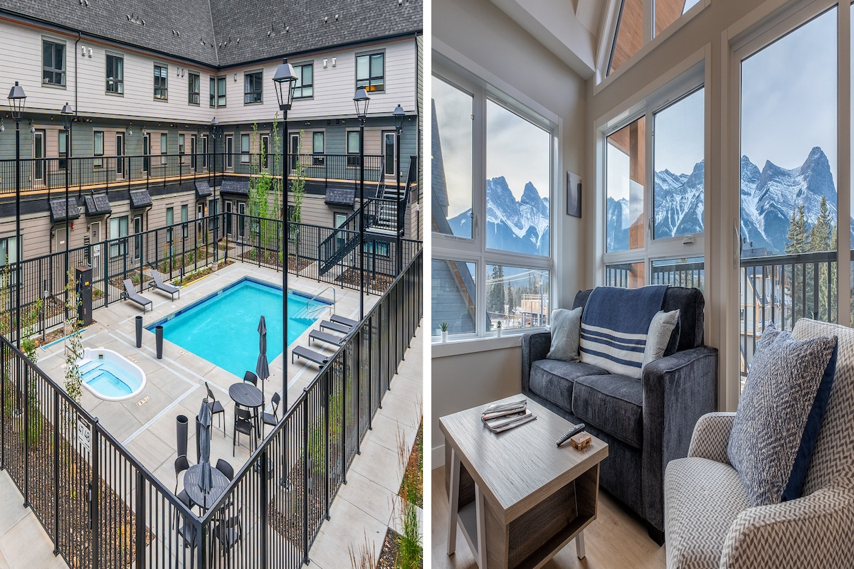 Relax on the private balcony with a cup of coffee as you watch the sunrise over the mountains. And only 1 min away from the Banff National Park gate! This vacation home can accommodate up to 7 adults and 1 kid. - SUPER comfy beds - 100+ TV Channels - In suite Laundry - WIFI - A private balcony with gorgeous mountain views - A gas fireplace - A spacious fully equipped kitchen - Air Conditioners - A huge backyard with BBQ grills(Shared) - Plenty of free onsite parking