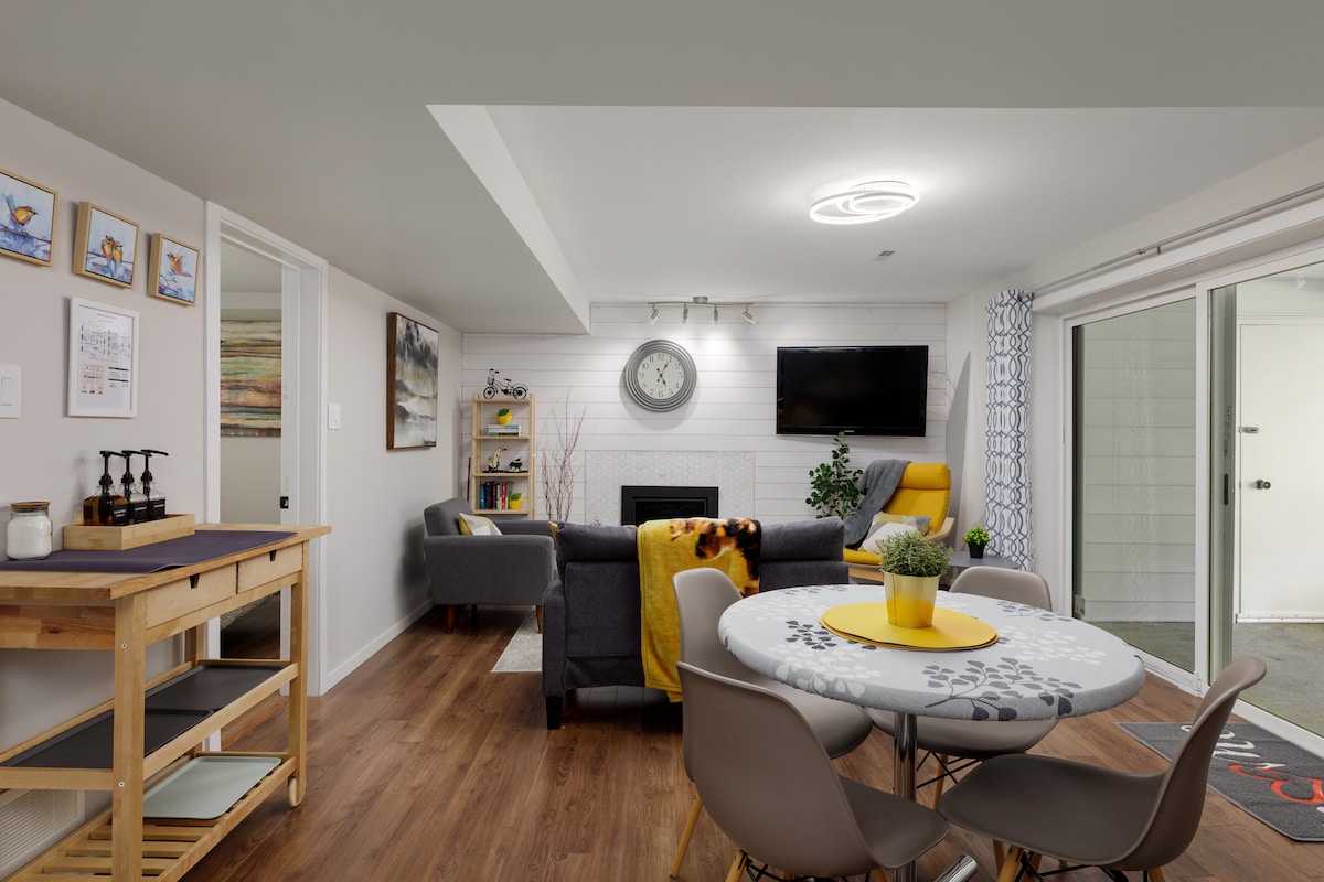 Spacious - sleeps 8 (4×2) comfortably. Clean, bright, NO stairs. 2 bdrm + queen folding matress + queen hide a bed, 4 piece bath, laundry, full kitchen/ dining - cooking facilities but NO range. 55" tv - Netflix, Prime, Roku, Tubi, You Tube etc. 1000 sq ft. of clean, quiet, comfort! Fully stocked kitchen with various: condiments/seasonings/spices. We offer complimentary fresh ground coffee, flavoured creamers, tea, fruit juice, cereal bars and fruit snacks for your morning growlies ☺️