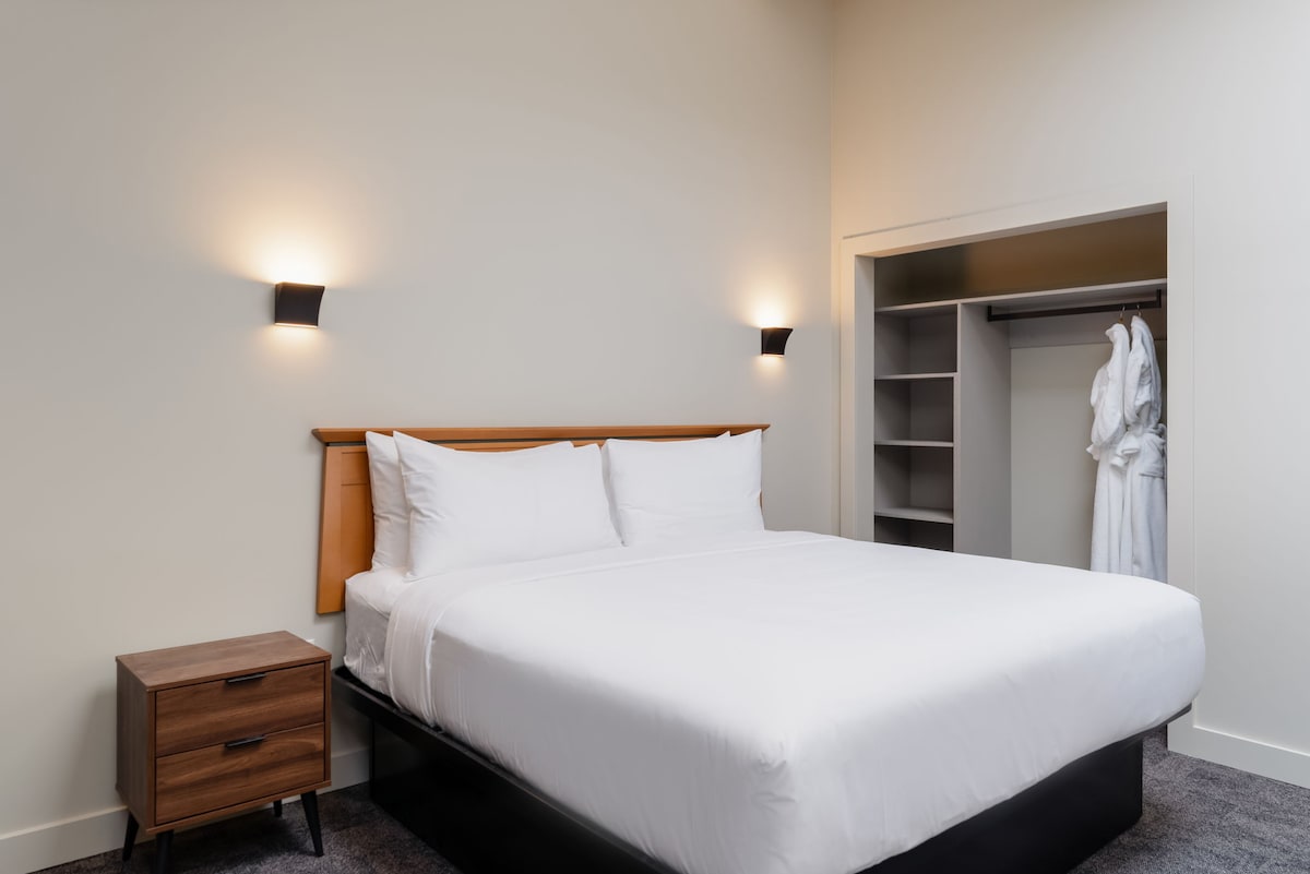 Luxurious hotel-room-style unit. Amazing KING bed, 55" flat-screen Smart TV, free high-speed internet, cozy sitting area with view, TWIN pullout sofa bed, table, 2 chairs, coffeemaker, mini-fridge. Spacious bathroom with shower & deep tub for relaxation. Full-size closet = great storage. 1-2 guests recommended. Total 3 guests if needed (for budget-friendly travel). 24-hr front desk/concierge service. Minimum check-in age is 25.