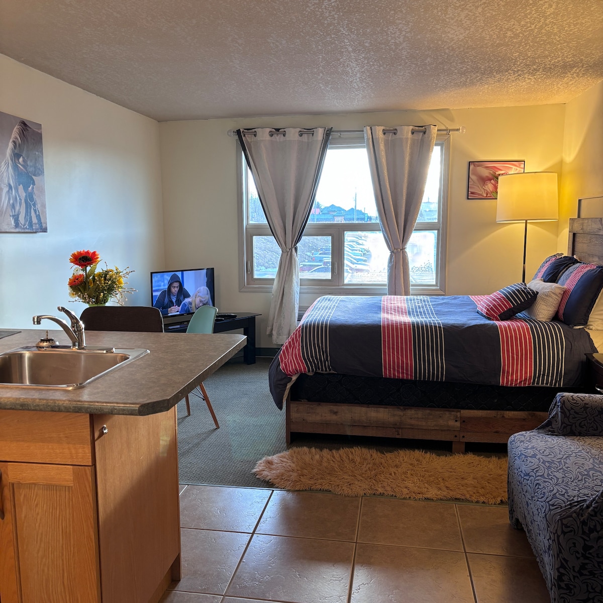 This place is locate in Hinton , 50 minutes driving to jasper, two and half hours driving to Edmonton. Adults only, all units are in second floor, have no elevator. This bachelor suit is suitable for singles or couples. Queen size bed , bathroom and kitchen; Good location, beside highway 16, easy to find, close to Tim Horton and A&W, two minutes driving to IGA shopping center and Shoppers drug mart , one minute driving to Smith’s restaurant; there is Japanese food Sushi place by next street.