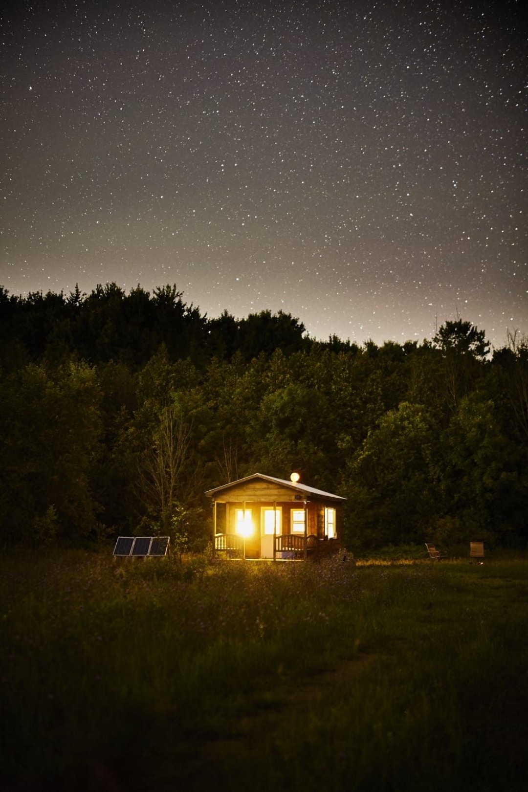91 acres, trails, total privacy, spring fed lake, solar power/propane heated, gas stove top, out-house, firepit, wi-fi ; canoe/paddleboat (seasonally) Self check in and self cleaning For those who leave a "light foot print" Basic kitchen utensils, pots, pans, and dishes are provided, BUT guests must bring their own drinking water, pillows and bedding and ice for cooler. We ask our guests to leave the cabin better than you found it and to take all garbage and recycling home with you.