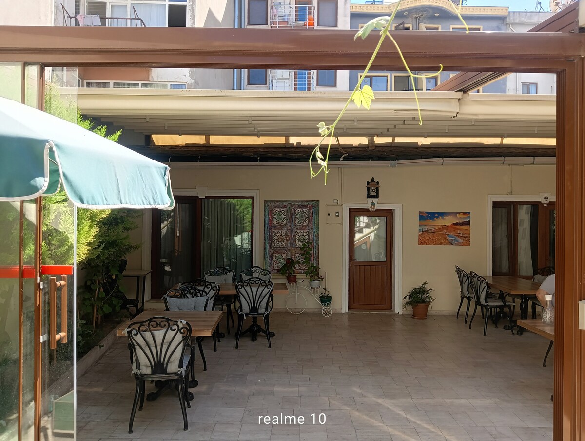 Gökçeada'nın tam kalbinde her yere ulaşımın mümkün olduğu, kocaman, huzurlu bir bahçenin içerisinde, ailenizle birlikte rahatlıkla konaklayacağınız güzel bir pansiyon. Tatiliniz süresince geniş serin bahçemizde, kuşların cıvıltısı eşliğinde çayınızı, kahvenizi yudumlayıp yemeğinizi yiyebileceğiniz bir mekan sizleri bekliyor.
