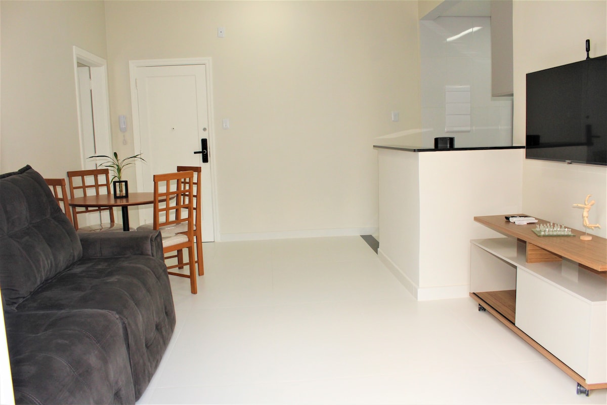 Esqueça suas preocupações neste lugar espaçoso e tranquilo. Apartamento reestruturado (reformado recentemente, banheiro e cozinha) decorado com mobília completa incluindo utensílios de cozinha, mesa e banho. Em frente a praia, com uma localização perfeita, perto de tudo como shopping, mercados, padarias, bares e restaurantes. Garagem garantida. É só entrar e curtir o momento.