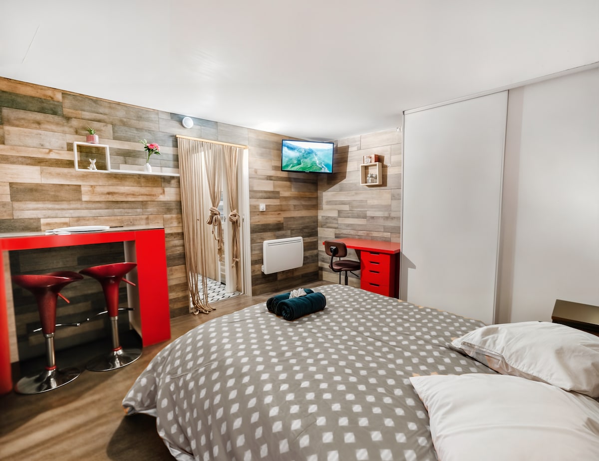 Welcome to the Private Spa by XELA You'll be in a fully equipped space for your physical well-being. • A cozy living room with an electric fireplace, television, and two relaxing armchairs. • A cinema room with a king-size bed and a giant movie screen, air conditioning. • Jacuzzi (balneotherapy) area, infrared sauna, and tropical shower. • Travel cot and high chair available upon request. Check-in: From 4:00 p.m., 100% independent. Check-out: Departures before 11:00 a.m.