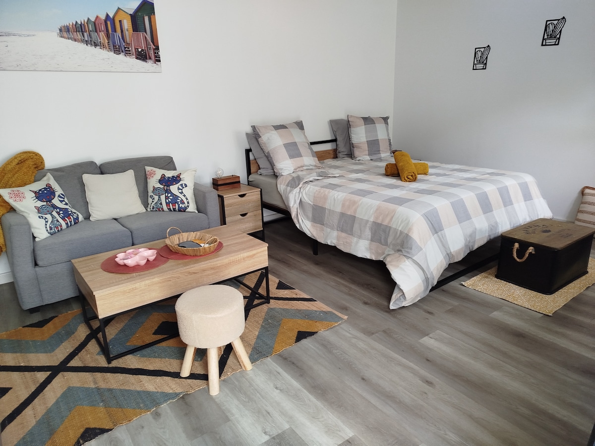 Oubliez vos soucis dans ce logement spacieux et serein. Lit d un mètre soixante, canapé lit 1 place, télévision avec canal +, cuisine équipée, salle de bain avec douche,toilette . A votre disposition: livres,revues,jeux de société,fer a repasser et sèche cheveux. Petite terrasse extérieure avec barbecue,table et chaises,garage moto.N hésitez pas à me demander,si il vous manque quelque chose,je me ferai un plaisir de pouvoir vous aider. Avec suppléments : , transferts, petit déjeuner.