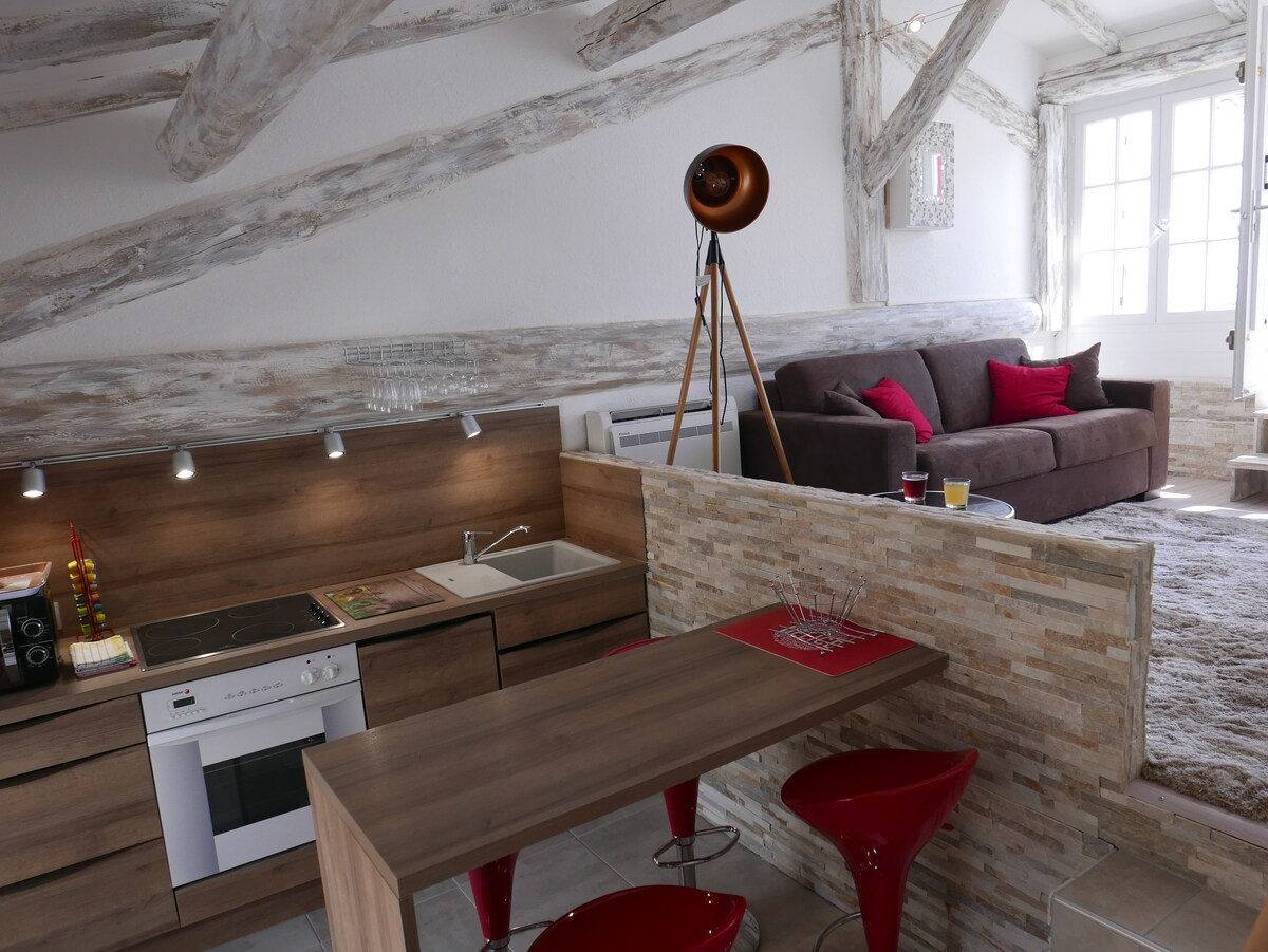 Appartement atypique, entièrement refait. Au sein d'un ancien chais reconverti en résidence, vous accédez à l'appartement en traversant un patio ombragé. Sous les toits, cet appartement plein de charme avec charpente apparente est équipé d'une climatisation réversible. Vous pourrez profiter de sa terrasse exposée plein Sud et d'un accès direct sur le port. La cuisine est très bien équipée, TV et wifi à votre disposition. Lit en 160 grand confort dans une chambre indépendante climatisée.