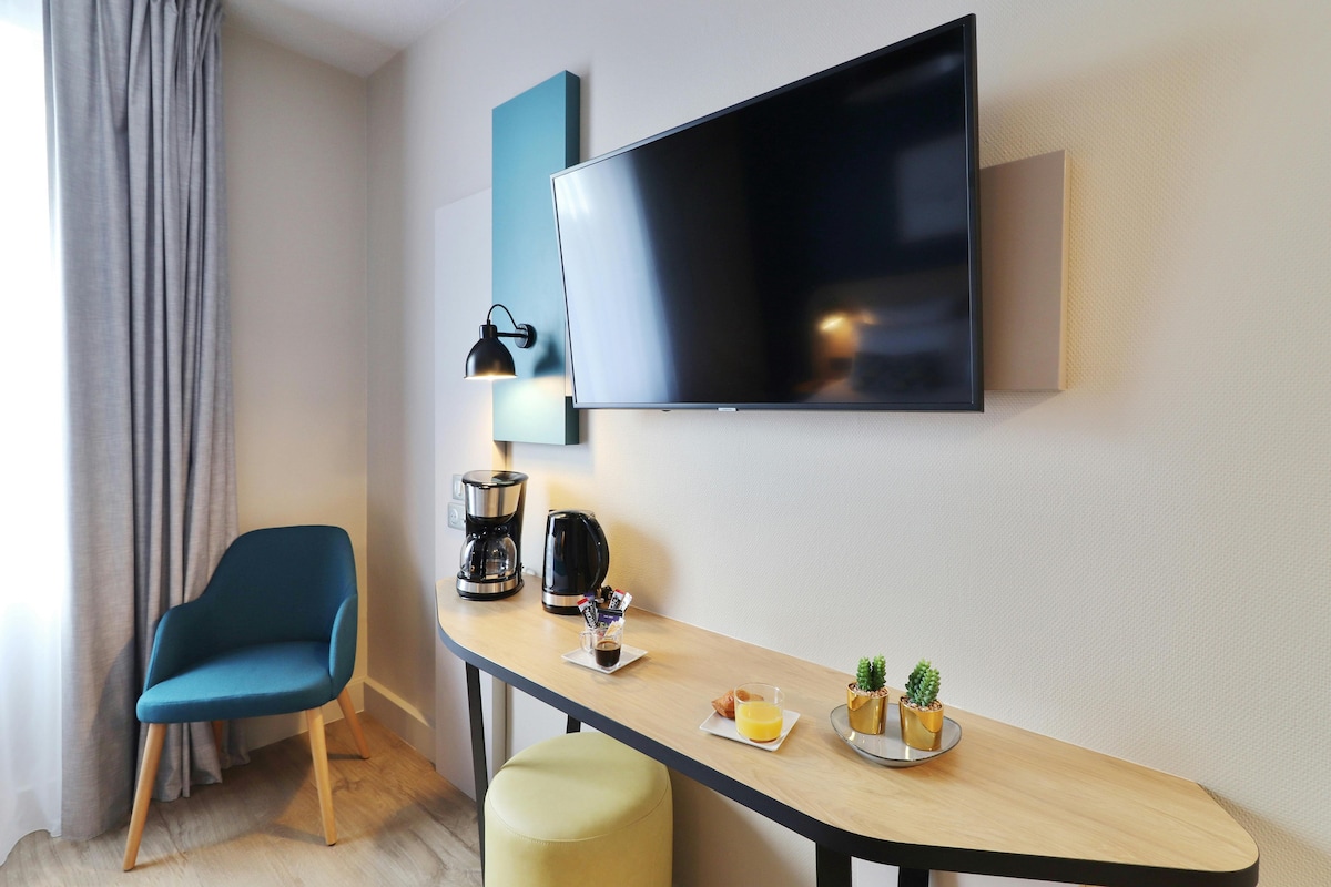 The Residhome Tolosa aparthotel is located between the Blagnac international airport and the historic center, across from Purpan hospital, and near a shopping center. It has direct access to the business, aeronautic, health, and university districts via the ring road. The studio includes: a living room with bed, an office area with a direct telephone line, a fully equipped kitchen (glass ceramic stovetop, refrigerator, microwave, dishes...), a bathroom, a flat-screen television.