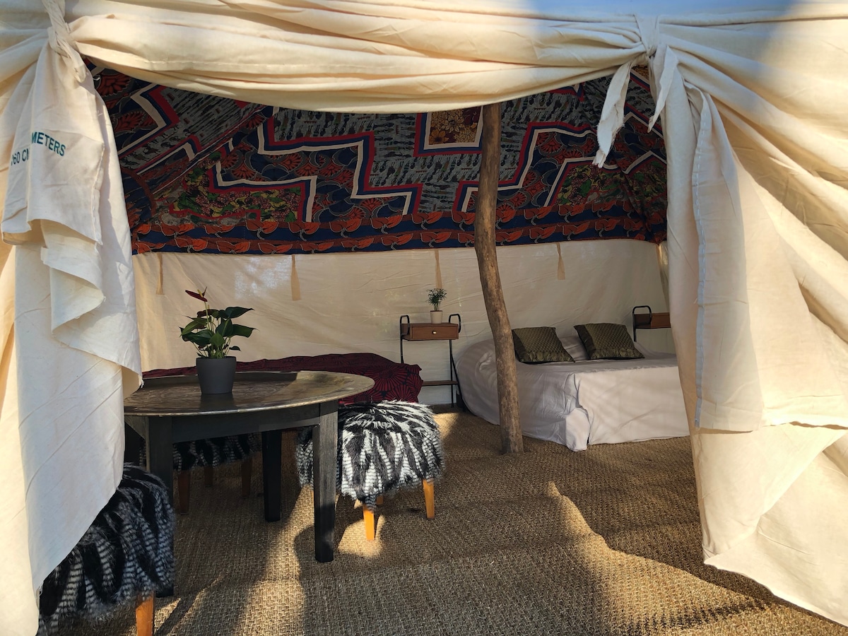 Glamping sous tente nomade dans jardin botanique