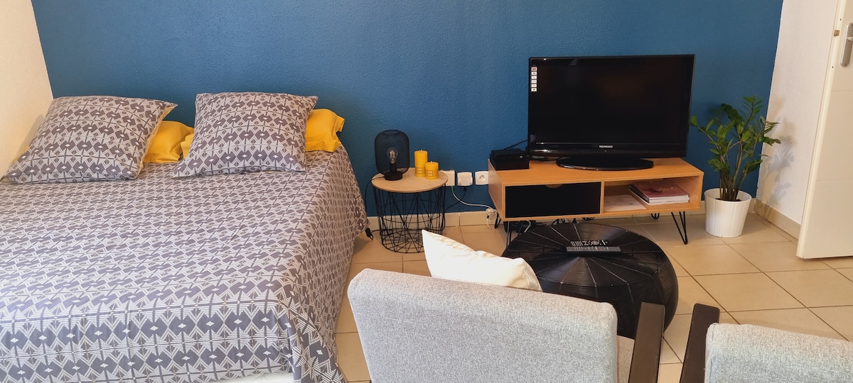 Bienvenue dans mon appartement ! Je l’ai décoré avec soin, en y mettant beaucoup de moi, pour qu’on s’y sente bien dès que l’on passe la porte. Les fenêtres donnent sur un petit jardin où pousse un grand mandarinier, vous pourrez même cueillir quelques fruits en saison. Il se trouve dans une petite copropriété pleine de charme, au cœur du quartier des Chalets, que j’aime pour son calme et sa douceur de vivre, à deux pas de l’hypercentre. J’espère que vous vous y sentirez aussi bien que moi.